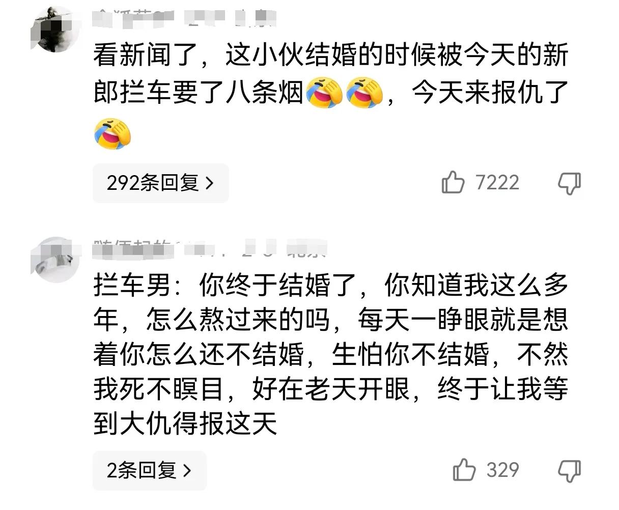 君子报仇十年不晚!当年结婚时被拦小伙拿了8条烟才被放行,如今拦小伙的人结婚,被小伙拦下,当年的拦截者如今成了被拦者,下车一脸谄笑,不知道是不是对于当年的荒唐行为有所忏悔! 最后小伙并没有以牙还牙,而是仅仅要了6条,也算是对往事一个交代吧!本来很喜庆的事非要乱搞,图啥呀!做人还是应该厚道点! 评论区一边倒! 拦婚车陋习