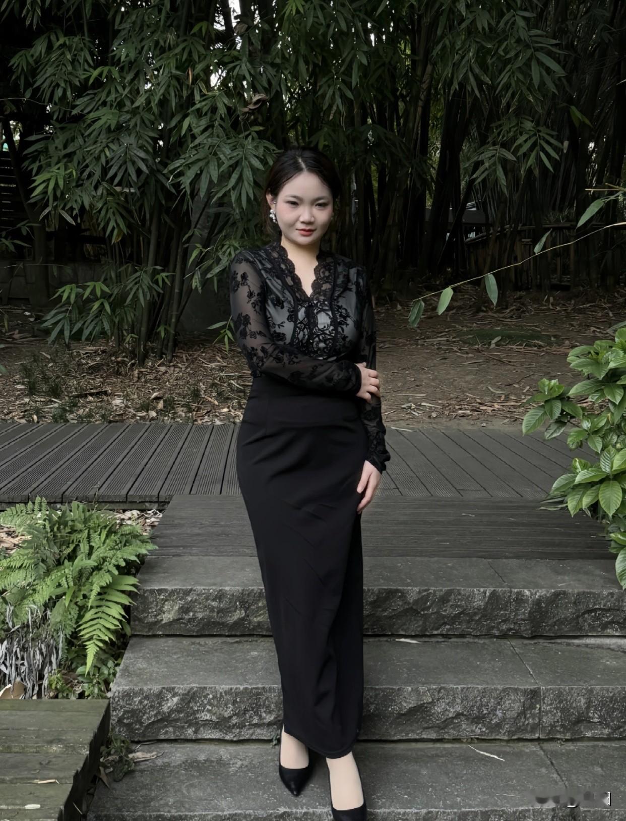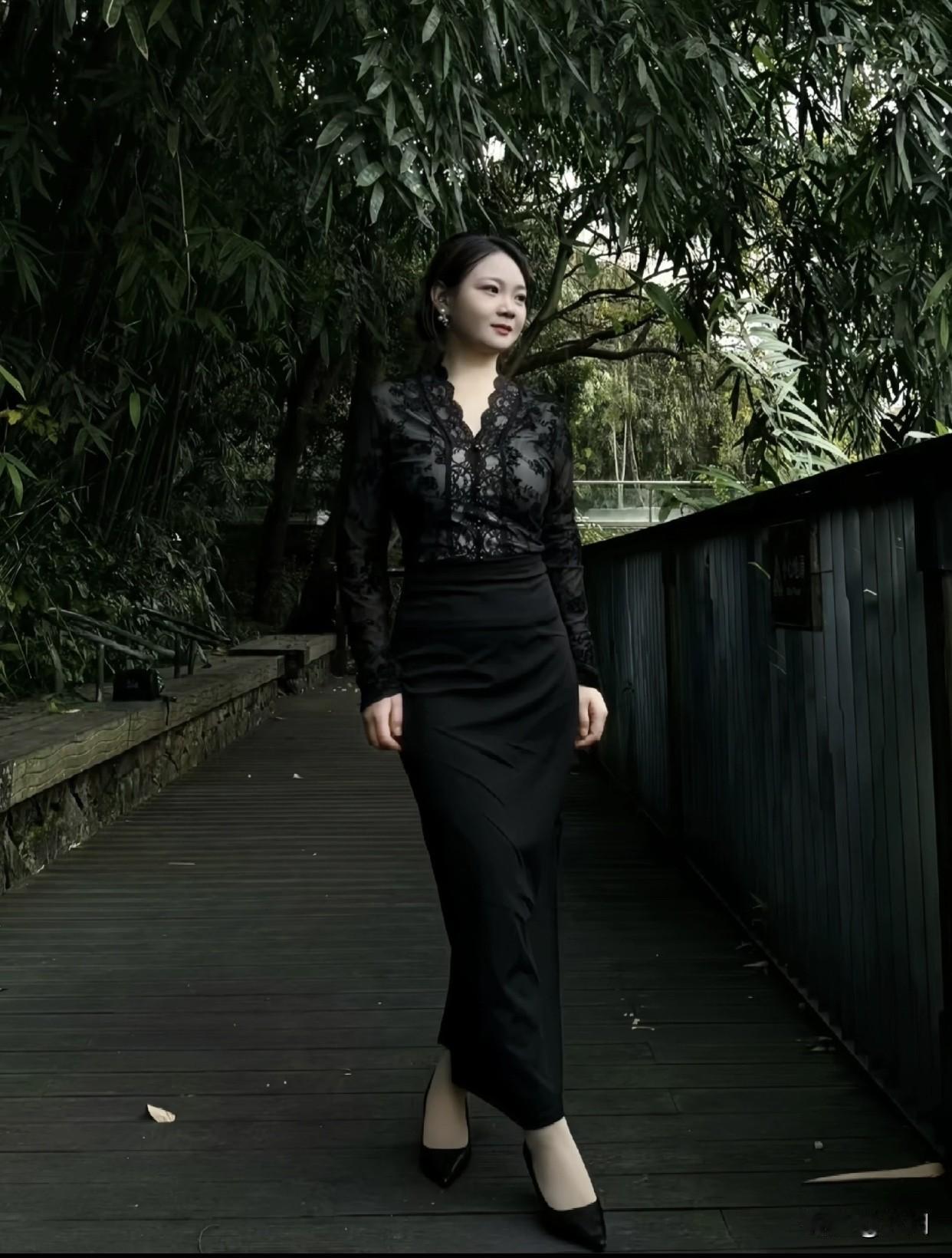怎么穿出成熟、气质感优雅漫步在绿意盎然的林间小道,黑裙与高跟鞋的完美搭配,尽显都市女性的魅力。