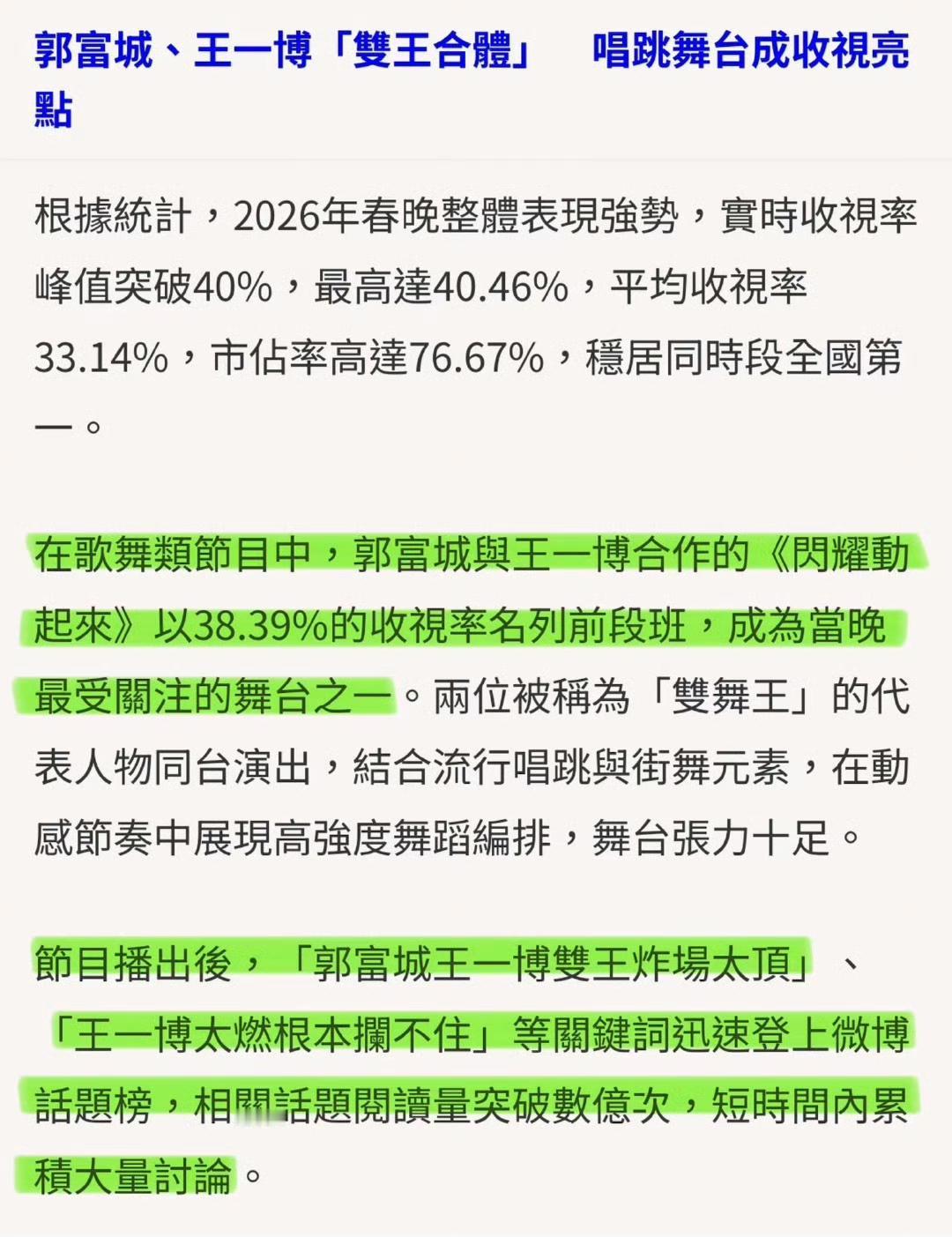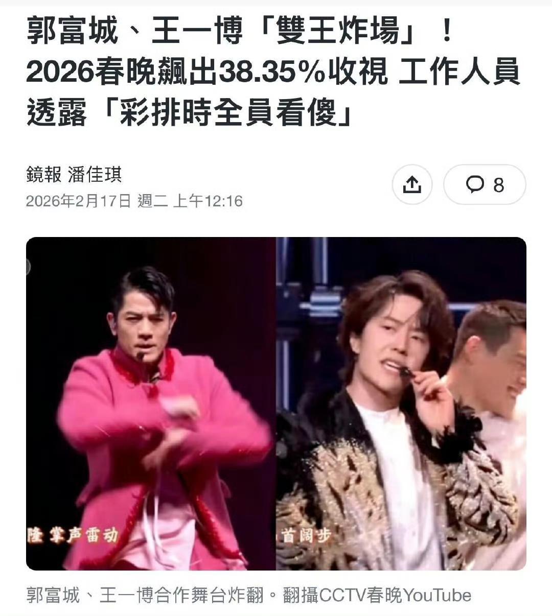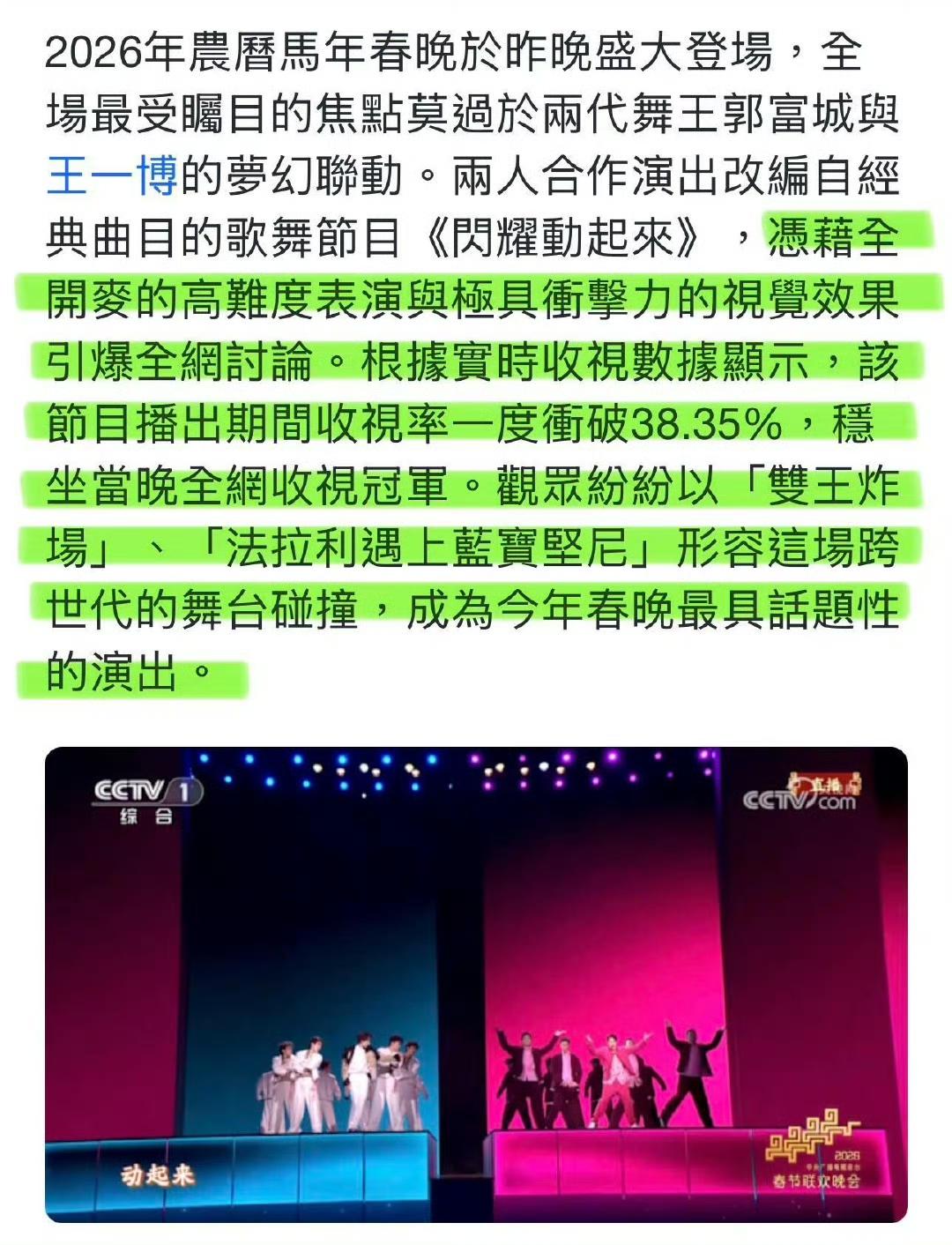 夸还是台媒会夸,王一博春晚《闪耀动起来》,台媒称:“为2026年留下了足以载入史册的经典瞬间。” “王一博郭富城收视登顶,双天王炸场,彩排时工作人员全员看傻” “跨世代的舞台碰撞,今年春晚最具话题性的演出” “王一博在舞台上展现了极高难度的街舞Solo,包含Popping与精准的卡点动作,并在快速Rap的过程中维持全开麦且气息稳定” 谁是热度焦点,谁是春晚万众瞩目所在,谁真正吸引了观众目光,大众心里都有数。 王一博 王一博2026央视总台春晚
