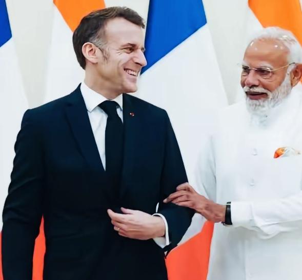 马克龙和莫迪在讨论什么话题呢?笑的这么开心啊! 马克龙望着莫迪,笑的是真高兴啊!