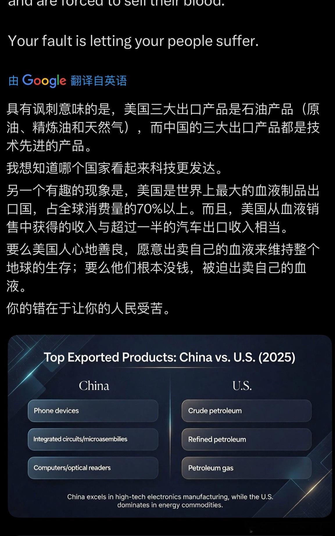 我:“美国三大出口产品都是石油产品(原油、精炼油和天然气),而中国的主要出口产品大多是技术先进的产品。偷你们的技术?闹呢!