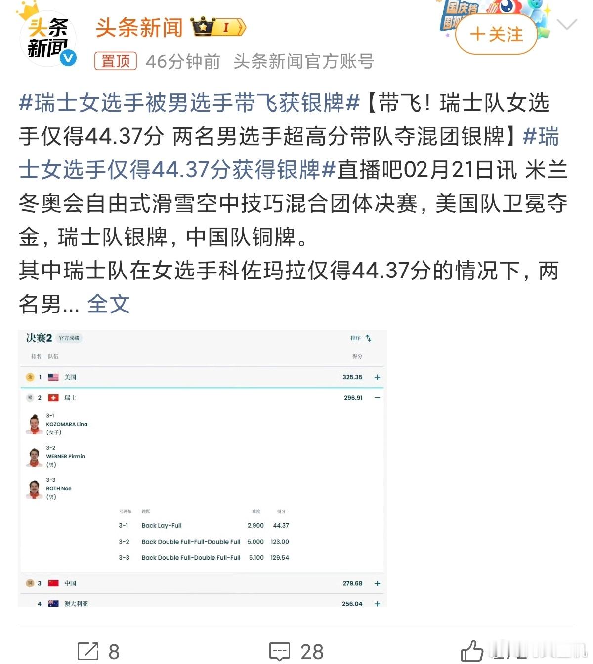瑞士女选手仅得44.37分获得银牌这完全属于躺赢,看似是男选手带飞女选手,事实上是女选手拖后腿了。