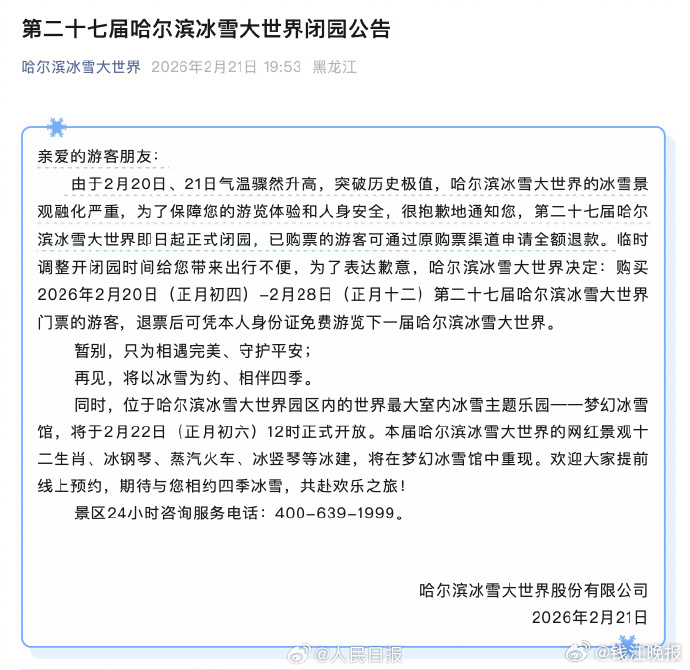 【#哈尔滨冰雪大世界决定闭园#】哈尔滨冰雪大世界发布公告:由于2月20日、21日气温骤然升高,突破历史极值,冰雪景观融化严重,第二十七届哈尔滨冰雪大世界即日起正式闭园,已购票的游客可通过原购票渠道申请全额退款。#哈尔滨冰雪大世界冰雪景观融化严重#