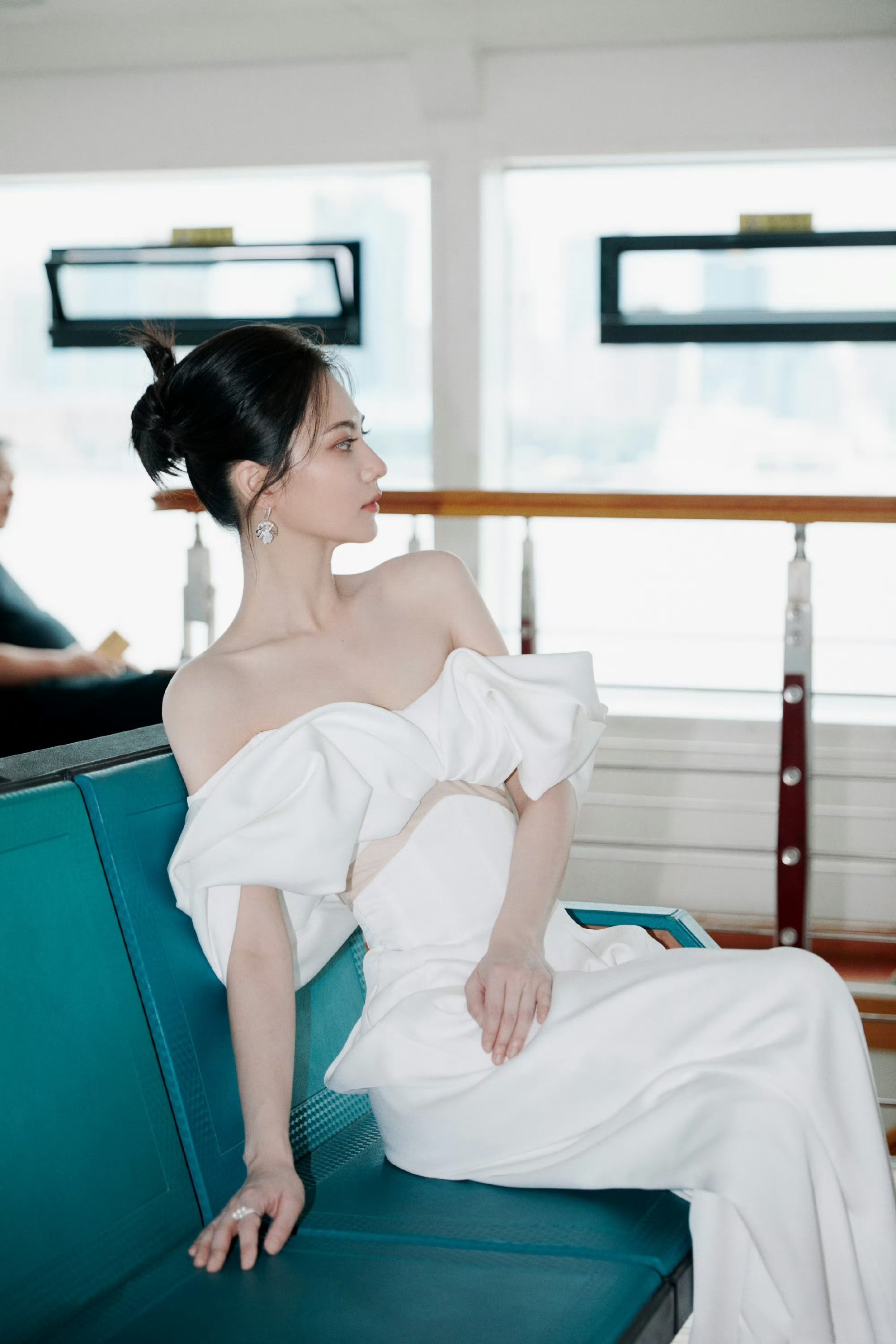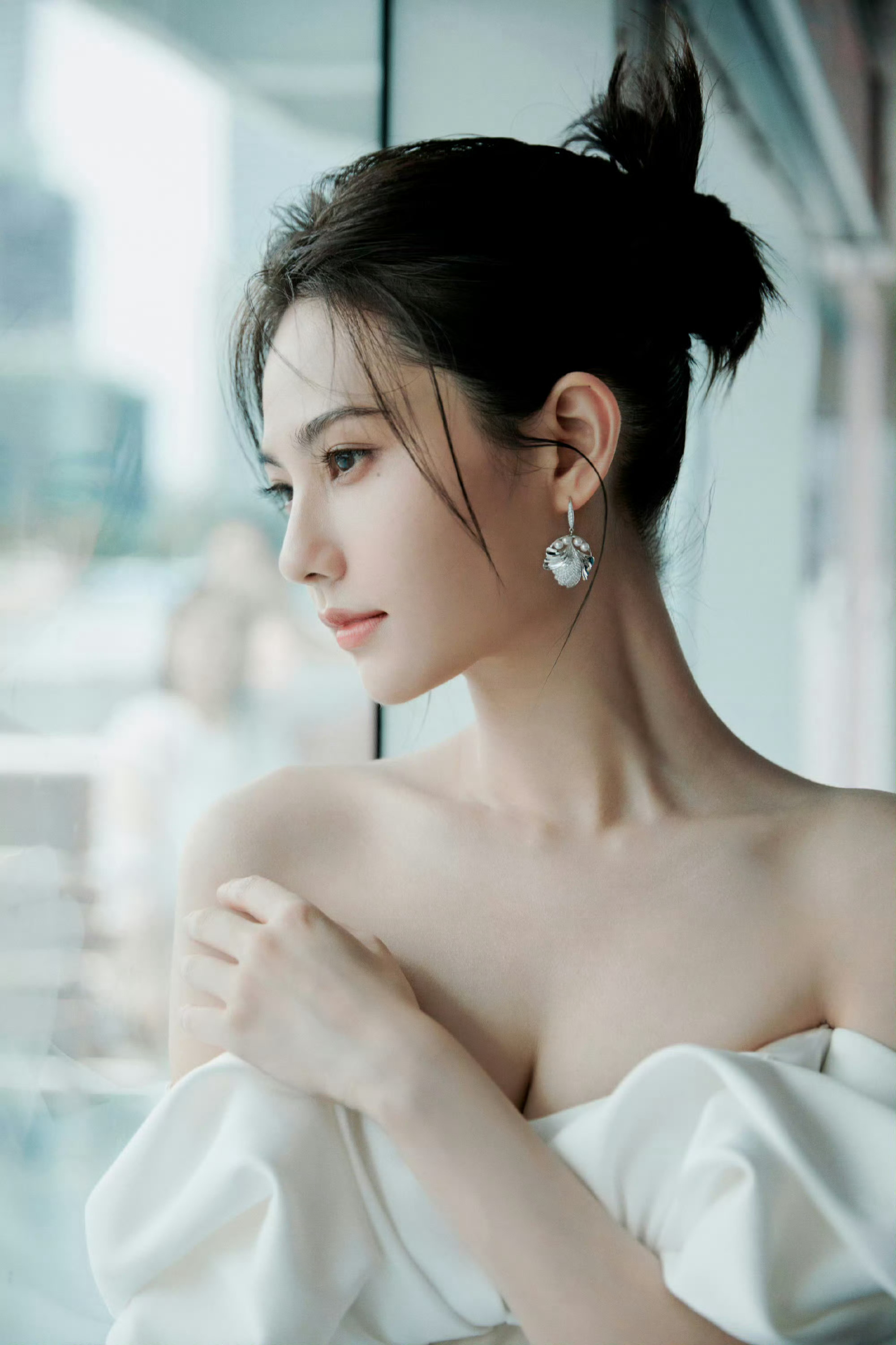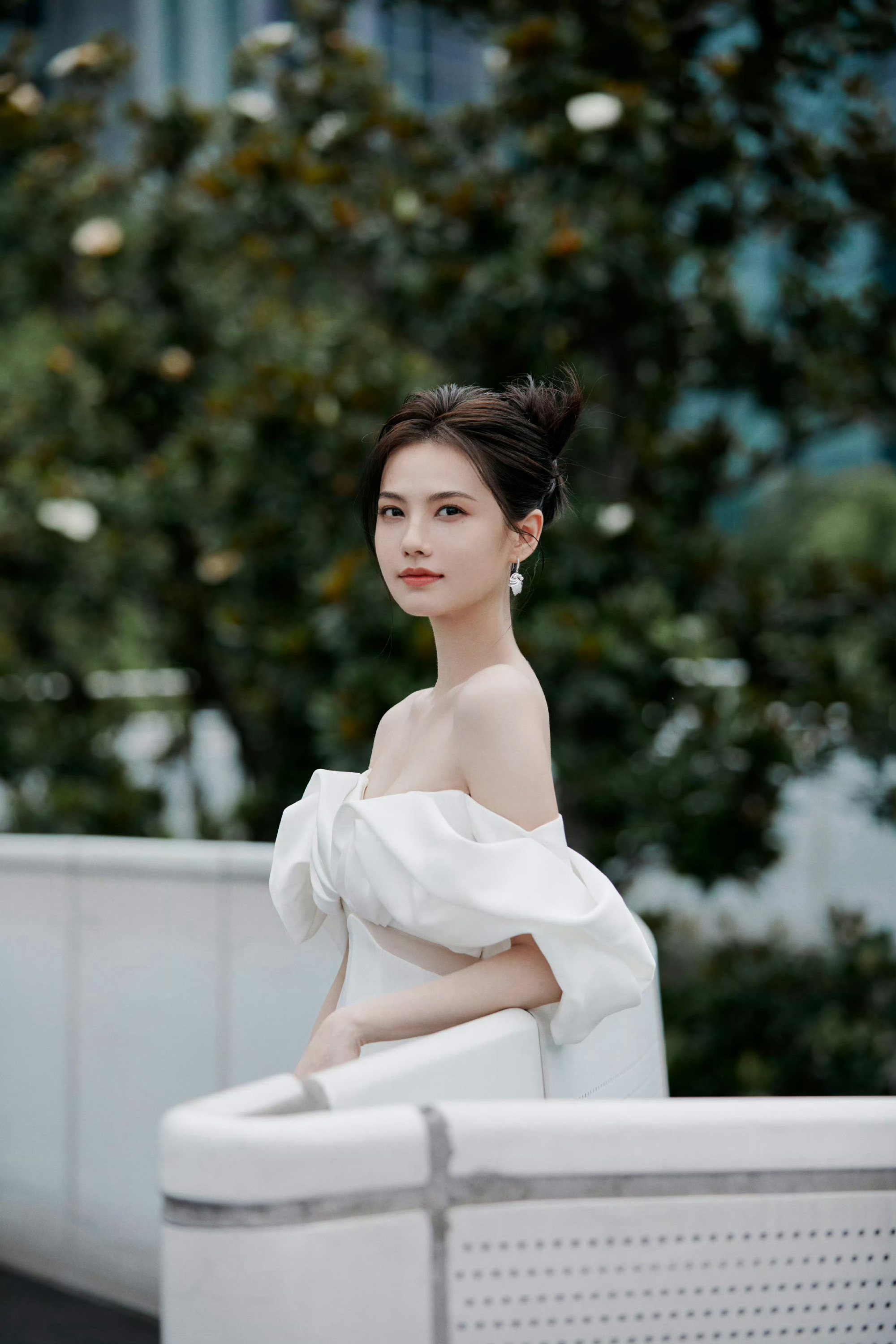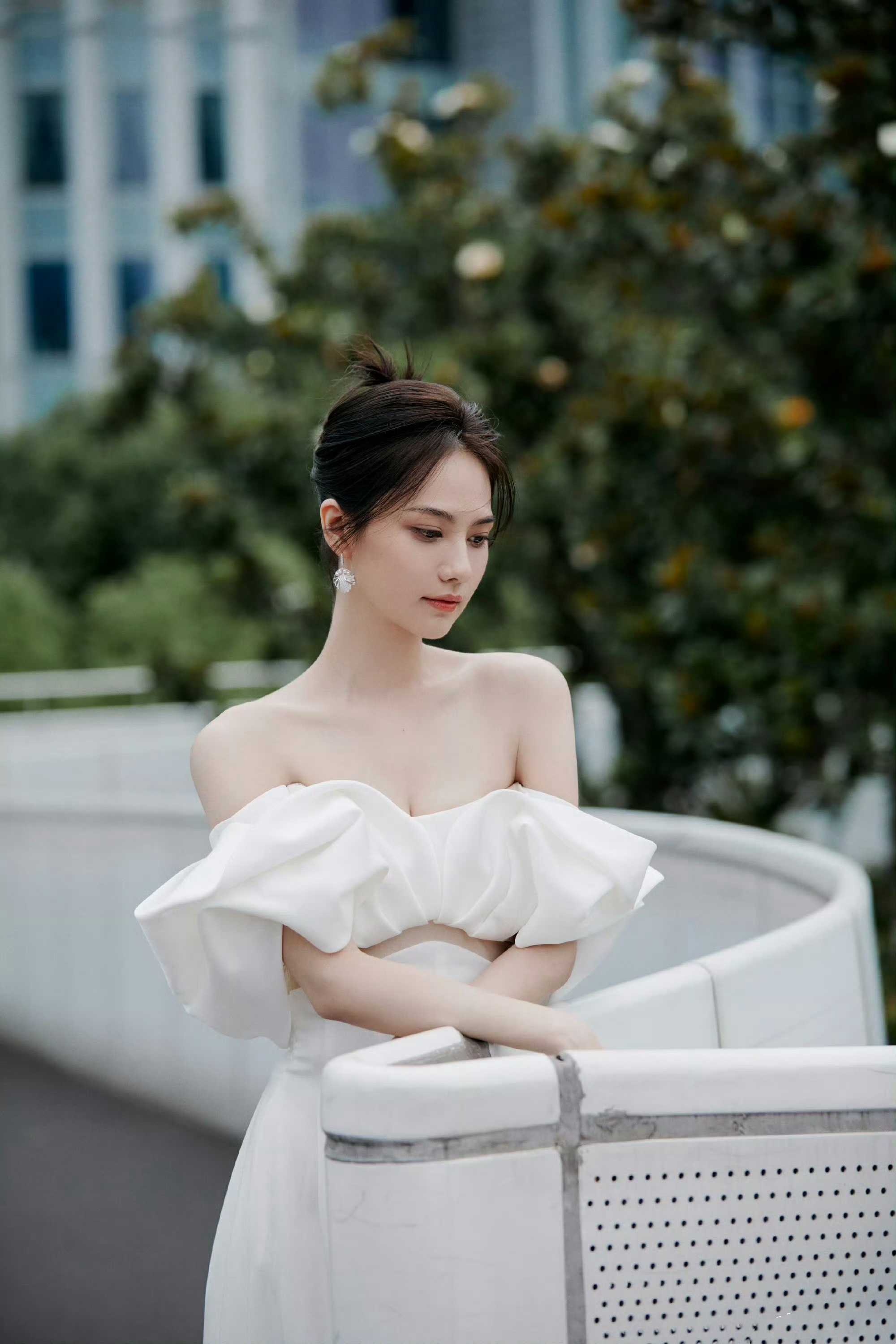 姜佩瑶,一身白色抹胸裙穿搭,好精致柔美的女明星。姜佩瑶
