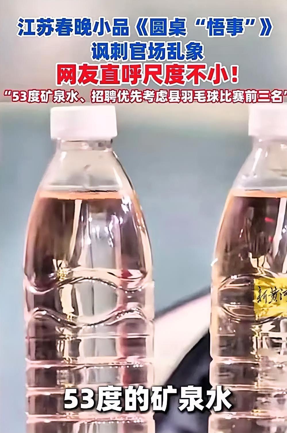 封神! 这两天全网都在传江苏春晚小品 的这瓶“53度酱香矿泉水”!谁能料到, 看《圆桌“悟事”》,那瓶“53度酱香矿泉水”,哪里是水,分明是名利场上的润滑剂。 听听那招聘条件:24到26岁,还得是县羽毛球赛前两名。 这吃相,简直不要太难看。 傻子都看得出,这坑是给谁量身定制的。所谓的选拔,不过是走个过场,把那个既定的“萝卜”名正言顺地种进去。 以前的晚会都在粉饰太平,这次倒好,把职场潜规则和这种恶臭的“萝卜坑”直接摊开来晒。 大家为何捧它是“天花板”? 不是包袱多响,是它敢把那层窗户纸捅破。 你在台下笑那是段子,回到单位才发现,这全是日子。