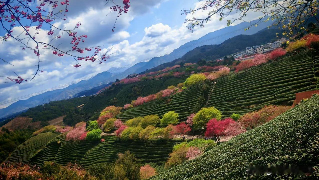 今年冬天的不同茶田叠成绿浪,粉花树散在坡间,云絮裹着山影轻晃。枝桠垂着艳樱,把春的甜意揉进这帧翠色里,连风都浸着茶与花的香。