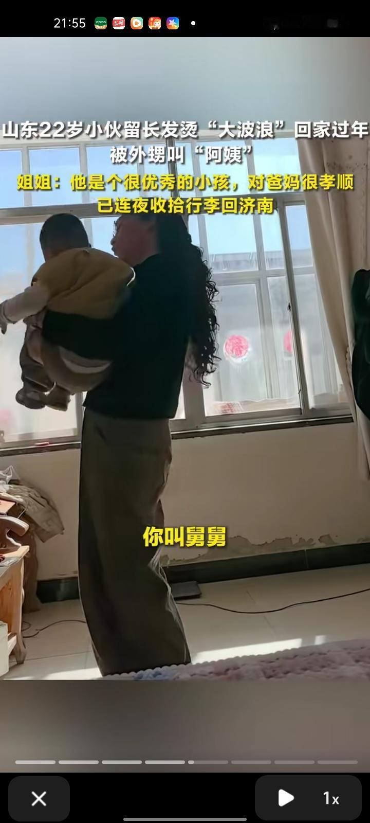 2月19日,山东滨州。小伙留长发烫“大波浪”发型回家过年,被外甥叫“阿姨”。 姐姐刘女士表示,弟弟在茶室工作,平时好古琴,爱京剧,待人温和,无不良嗜好。这回烫了大波浪,纯粹是脑子一热玩抽象。他是个很优秀的小孩,对父母很孝顺,已连夜收拾行李回济南。 过年本就是一场随心所欲的快乐实验,爱古琴、懂京剧、孝顺懂事是他,一时兴起烫大波浪、被外甥喊阿姨、连夜潇洒跑路也是他。有点可爱、有点抽象、有点不按常理出牌,才是年轻人最鲜活的过年模样,开心自在,比什么都重要。