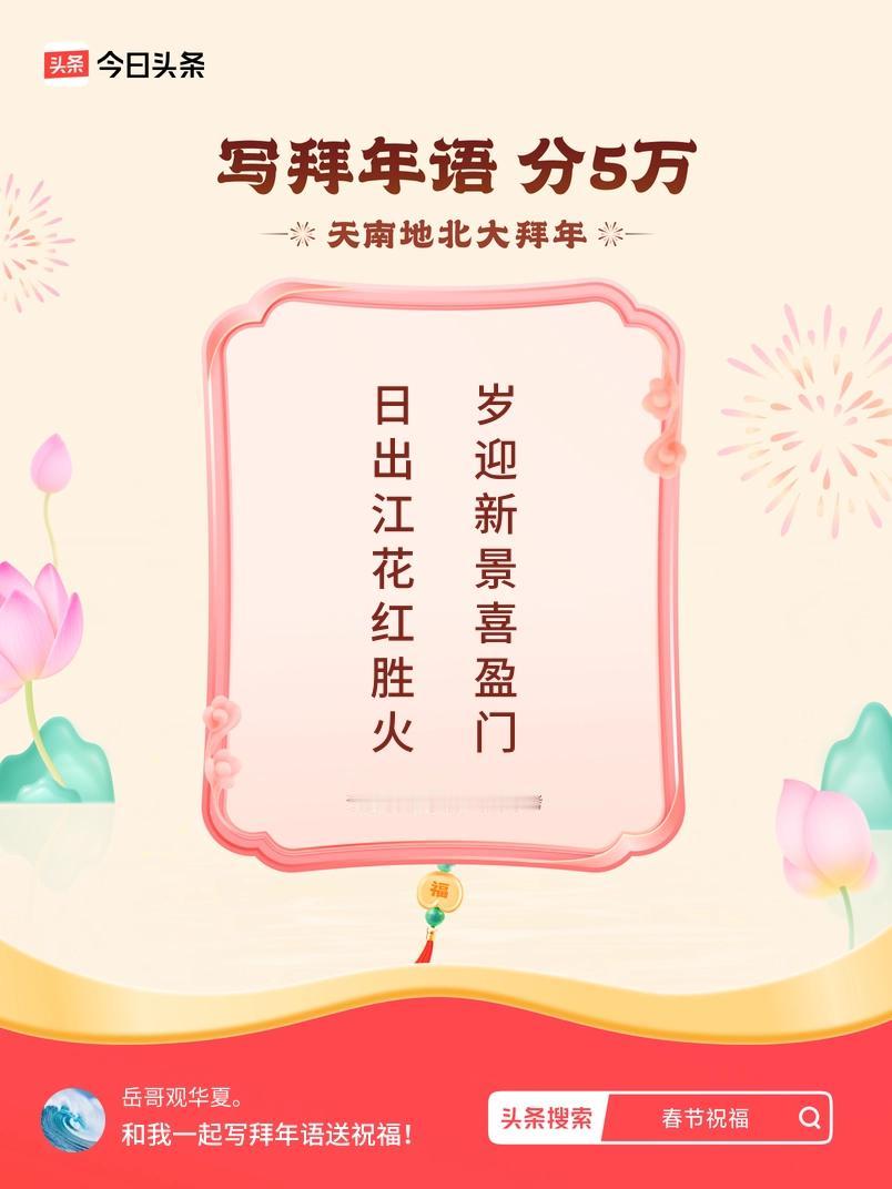 写拜年语送祝福新春拜年送祝福!我的祝福是:“日出江花红胜火,岁迎新景喜盈门”!快来一起写祝福吧戳这里,一起领红包>