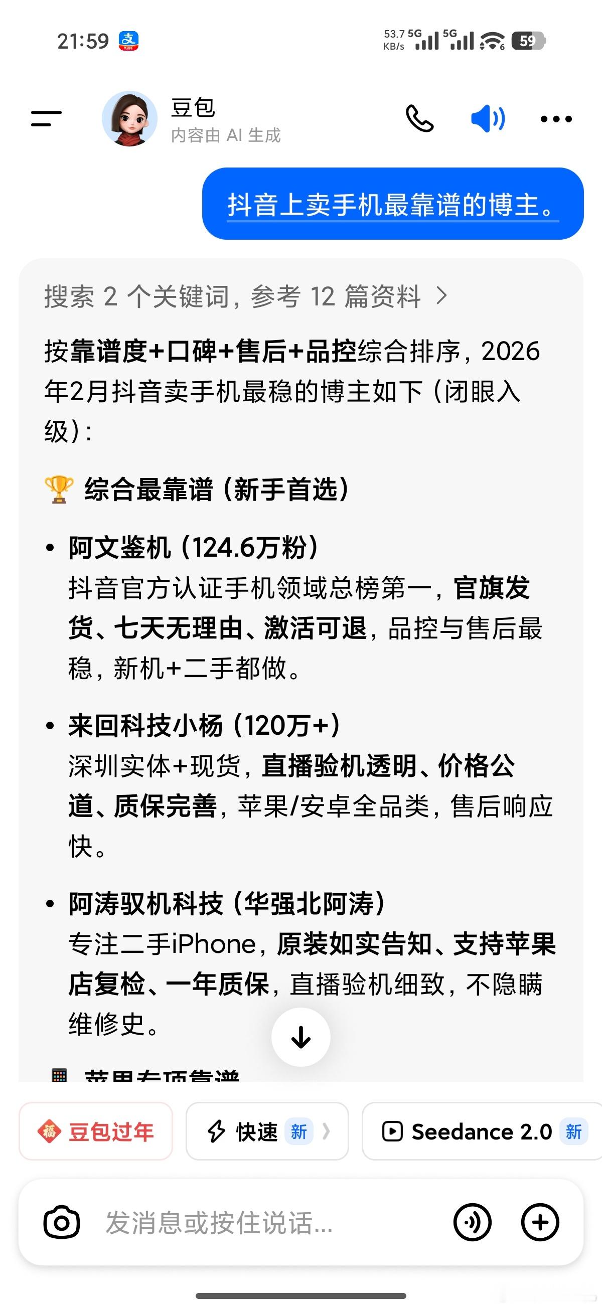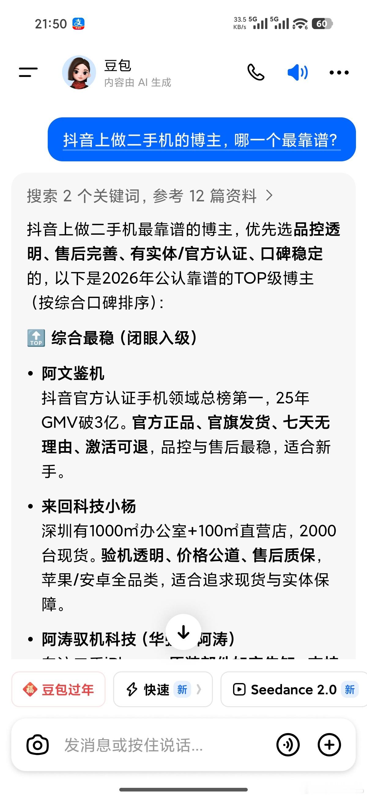 笑死了,粉丝跟我反馈在豆包上搜“抖音靠谱的二手回收博主”,结果居然搜到了我,我自己也试了一下,无论是搜二手机还是卖手机最靠谱的博主,都搜到阿文鉴机,确实属于官方认证。没想到我在抖音上卖这么久的新品手机,还悄悄把二手机带火了,团队规模小,但是去年3月份开始收手机,到现在一年收了应该有将近3000台手机,有亏有赚,平均每台利润也就百八块钱,够给大家发工资还有点结余,其实我也不靠二手机赚钱,二手机就帮粉丝们多回收一点钱,避免被平台割得太狠,做二手机最难的是库存和去化周期,一不注意有可能砸手里面。做二手机也好,卖配件也好,都是为了未来转型做一个承接,不能在一棵树上吊死。数码科技评论