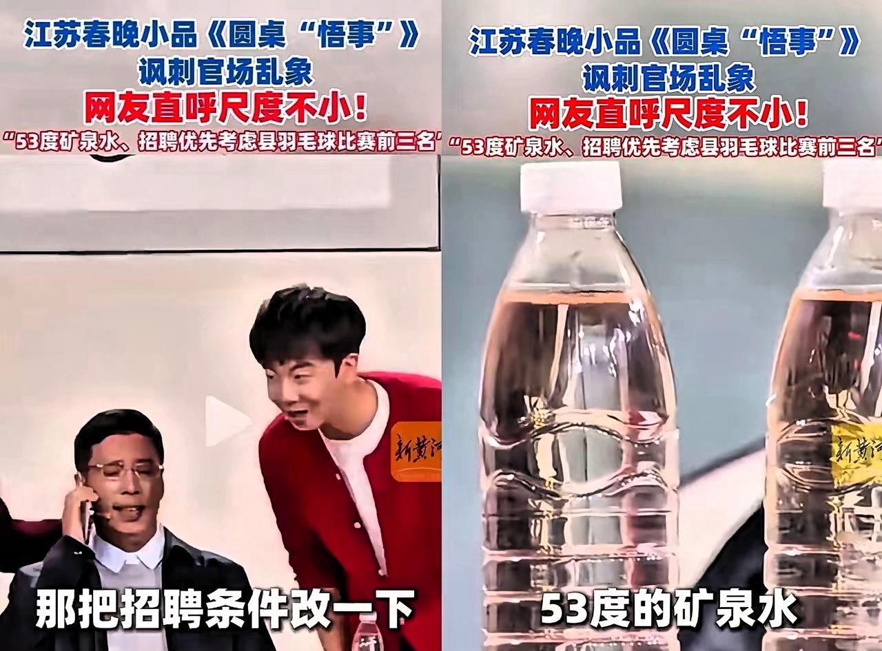 封神! 这两天全网都在传江苏春晚小品 的这瓶“53度酱香矿泉水 今年江苏春晚的小品《圆桌“悟事”》,几句关于招聘的家常对话,没有夸张的肢体动作,也没有刻意制造的笑点,却精准地走进了普通人的心里。 故事设定在一间看似普通的毛坯快餐店,昔日“国际饭店”的印记还在,这场饭局就像一面镜子,照出了人情往来里的隐蔽细节。贾旭明饰演的角色,前一秒说着招聘是高压线,后一秒听闻对方的亲属关系,语气便自然切换,这种细腻的转变,恰是生活里常见的真实场景。 小品里的招聘细节最能引发共鸣。县羽毛球赛第三名符合条件却被淘汰,理由是第四名个子高,等对方亮出关系,招聘标准又随即调整 。“萝卜在哪儿,标准就在哪儿”,这句台词没有激烈批判,却把求职中的无奈说得明明白白。这些情节不是凭空创作,而是主创团队收集真实求职经历后的提炼。 它的走红,并非因为“尺度大”,而是做到了不回避现实。很多晚会节目追求热闹与圆满,却忽略了普通人的真实感受。这部作品用克制的表达,把大家平时遇到的困惑、无奈,用喜剧的方式呈现出来,既让人心头一暖,也引人思考。 好的喜剧,从来不是为了逗笑而逗笑,而是能让观众在看完后,想起自己的生活。《圆桌“悟事”》做到了这一点,它证明了贴近群众、扎根现实的作品,永远能获得大家的认可。