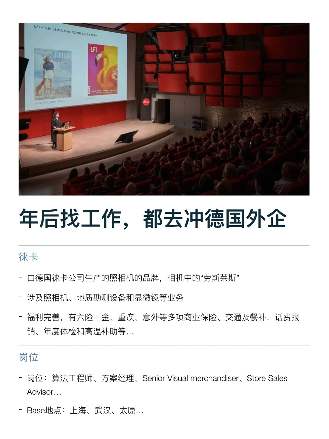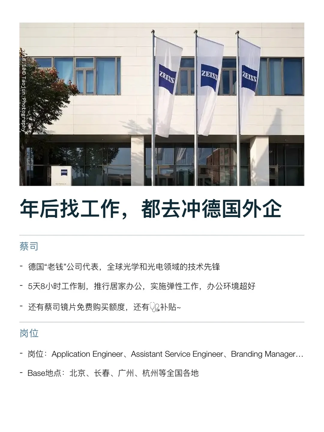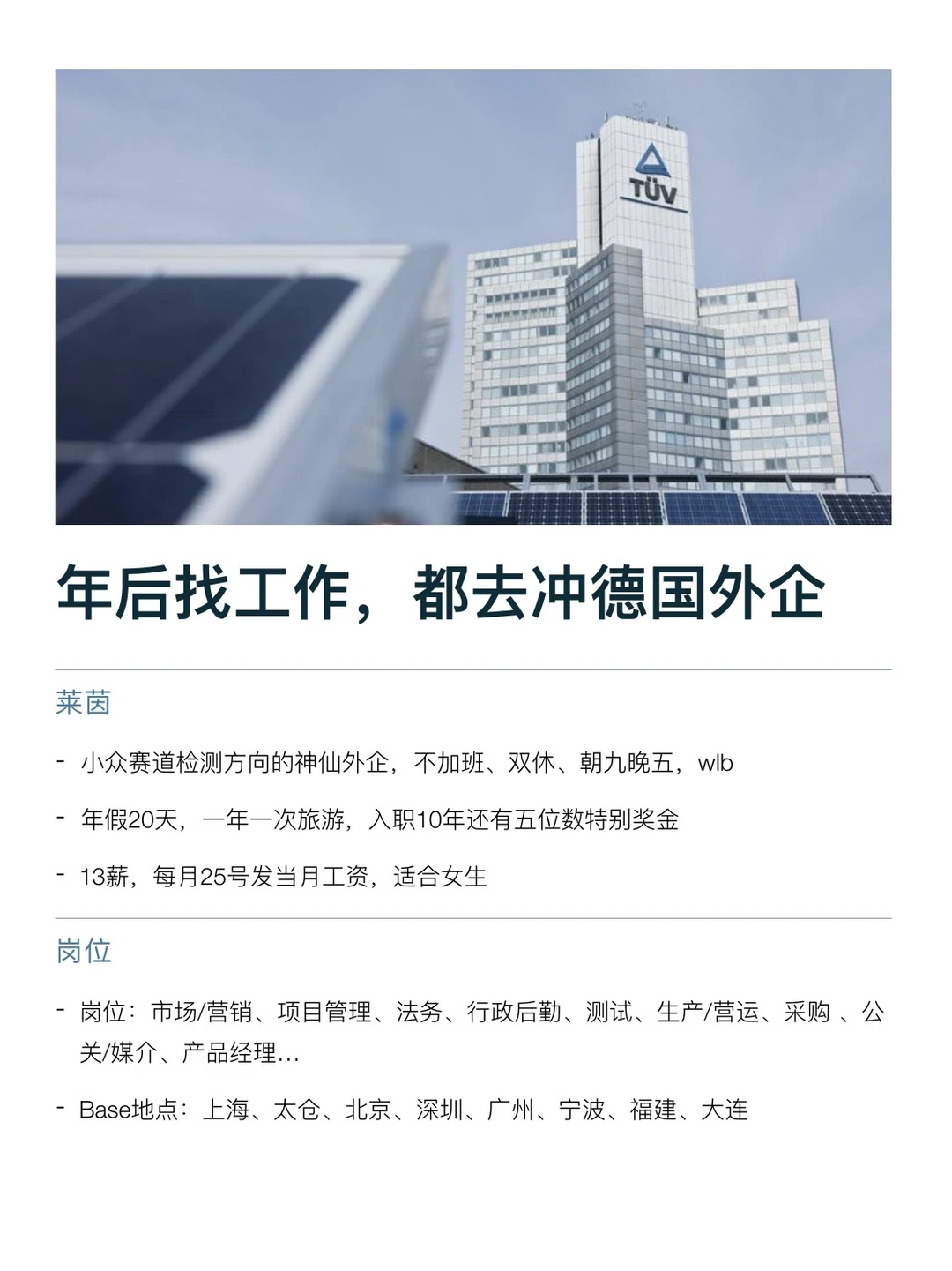 很多人一提德国外企就会想到“有边界感”,确实是这样的,很多德资公司的节奏都不卷,流程体系也很成熟,各司其职,很少无效加班,准点下班反而是常态 行业覆盖面真的很广,岗位也不只工程师,像采购、供应链、销售支持、人事财务这些文职岗也都有需求 福利也属于外企里很能打的,年假15天起、WFH制度、长期服务奖励,稳定又适合长期发展 坚持日更✊🏻,对外企感兴趣的欢迎常来看看