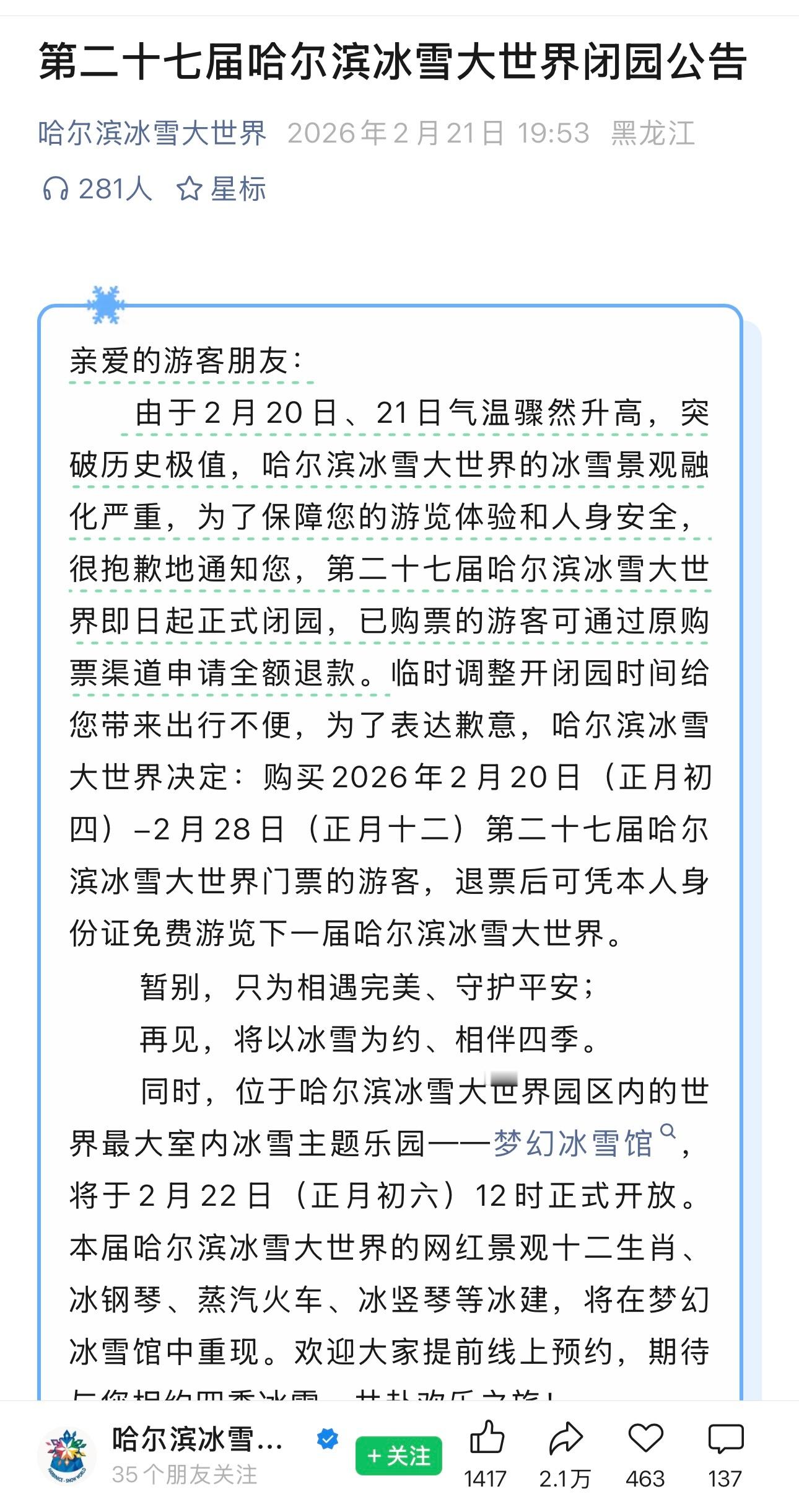 刚看到新闻说哈尔滨冰雪大世界即日起闭园了,