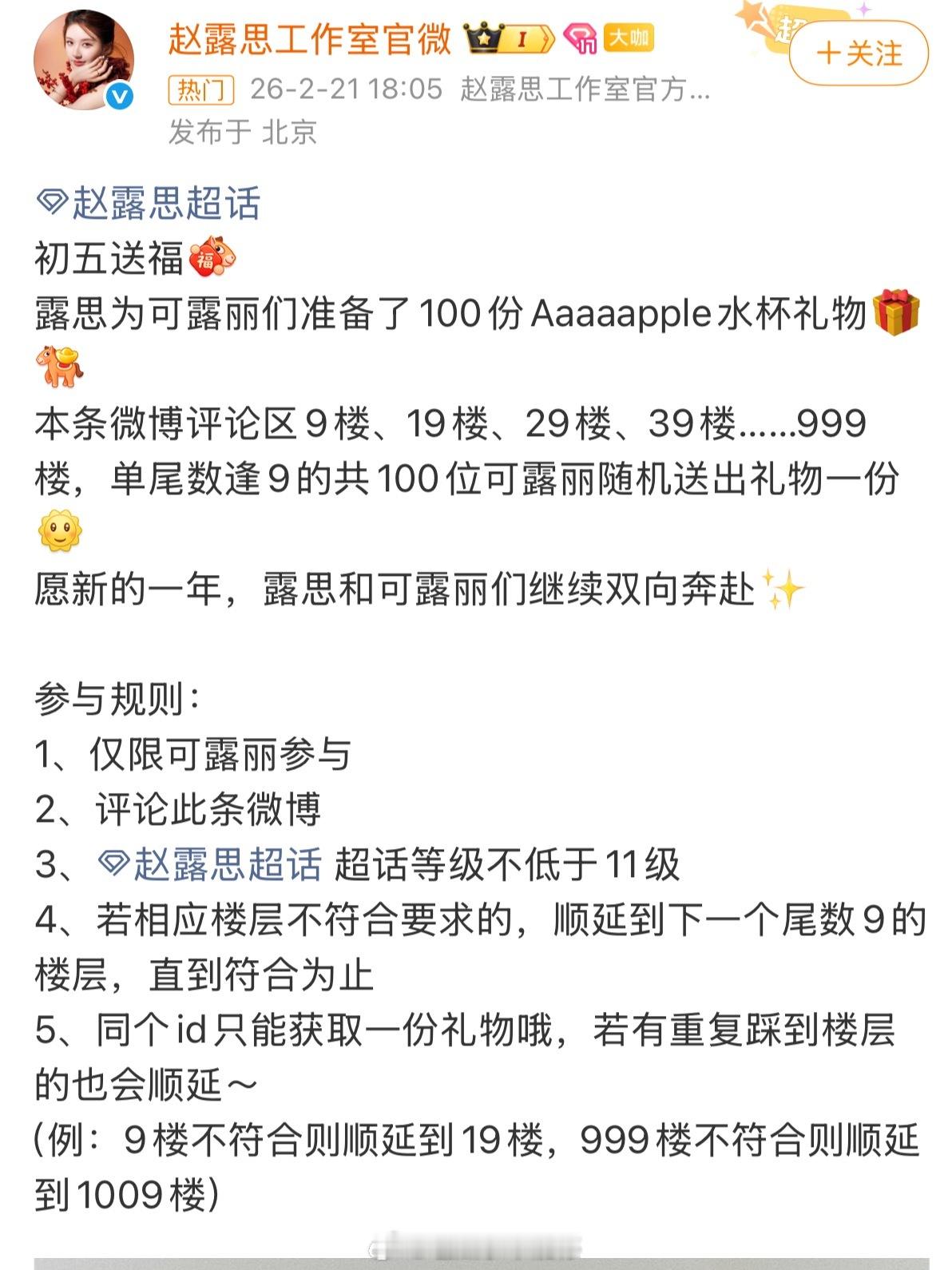赵露思对粉丝也太好了,大年初五给粉丝送了100份礼物,踩楼就可以粉丝好幸福啊