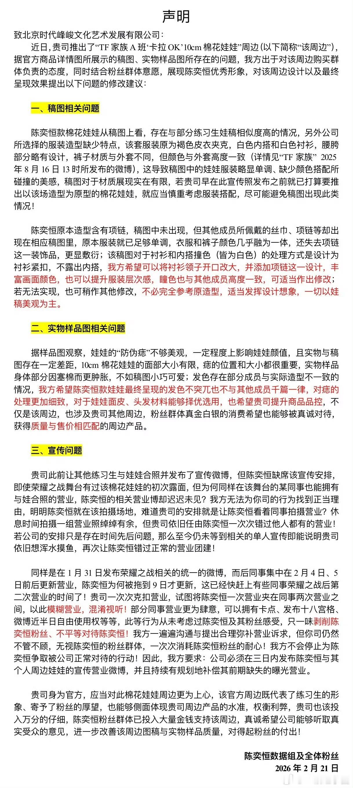 陈奕恒 粉丝向sdjf维权!主要是稿图问题,实物样品图问题宣传问题!支持!