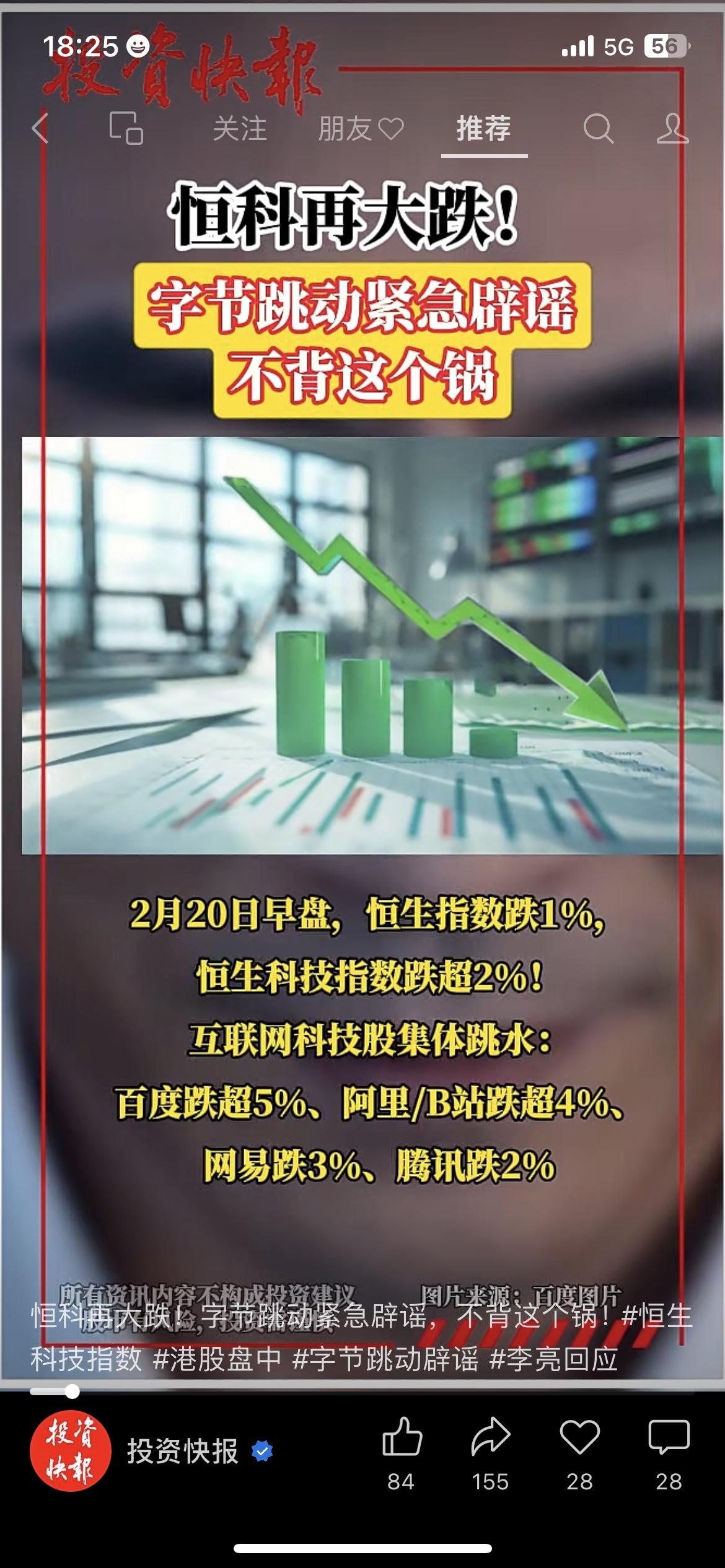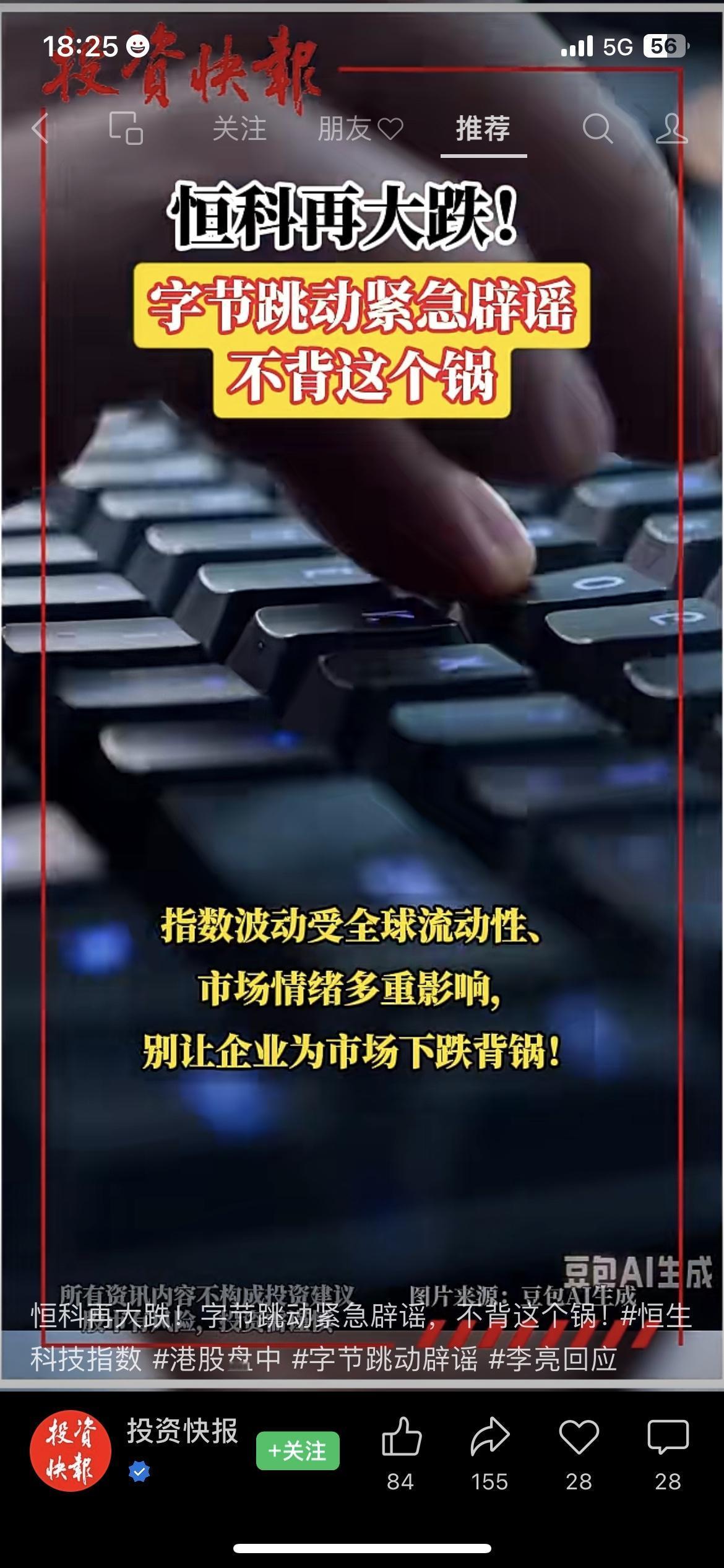 字节辟谣恒科最大空头 市场有风险,投资需谨慎。 恒生科技一调整,谣言马上就来了。 有人说字节是恒科最大空头,官方直接紧急辟谣:荒唐、恶意。 市场涨跌本来就受情绪、流动性、外部环境多重影响。 拿一家企业背锅,完全是带节奏、博流量。 普通人一定要擦亮眼睛,不信谣、不被割、不慌仓。 你遇到过这种市场谣言吗? 字节跳动辟谣 恒生科技 投资谣言