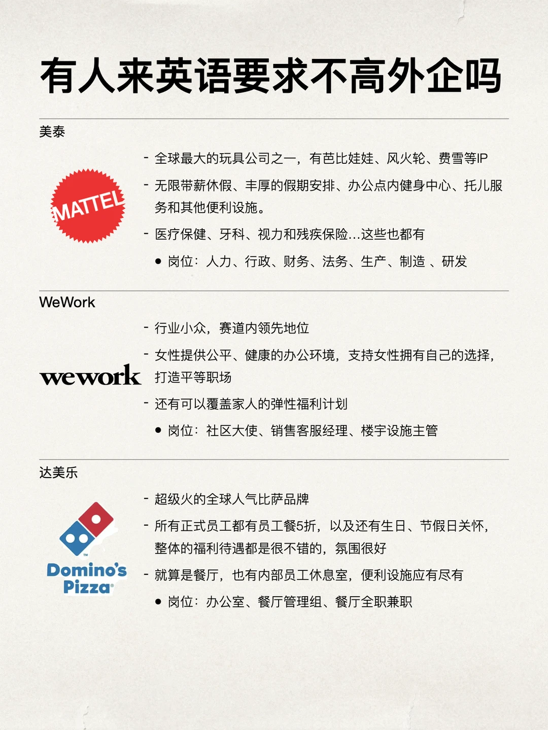 很多人一提外企就被英语劝退,但其实并不是所有岗位都对英语㓟要求,英语更像个加分项、而不是必须项 像很多外企其实要做本土化的运营,所以供应链、采购、人事、财务、销售支持这些,日常用英文场景没那么多 外企的福利还是很顶的,:955、年假 10–15 天、弹性办公都有,如果是追求wlb的,完全可以去试试这些外企 坚持日更✊🏻,帮大家在找工作路上顺利拿到offer!