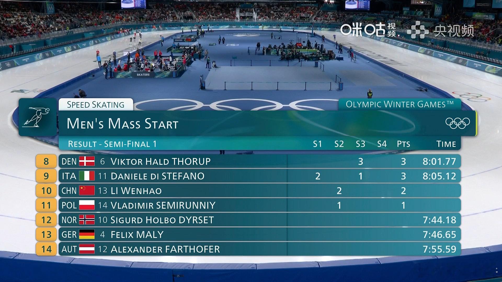 吴宇进集体出发决赛米兰冬奥会速度滑冰男子集体出发半决赛第二组,中国选手获得40积