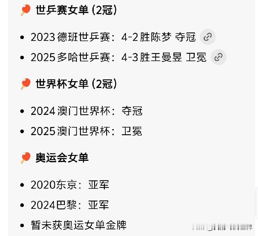 孙颖莎现在已经超过邓亚萍,真不知道你是故意黑孙颖莎还是夸她,邓亚萍2个奥运会单打冠军,孙颖莎目前连一个都没有,邓亚萍90年极具统治力,三大赛拿了2个奥运会女单冠军、3个世乒赛女单冠军,世界杯赛事因为在邓亚萍接近退役才有这项赛事,所以世界杯只有1个,孙颖莎就算拿到下届洛杉矶奥运会女单冠军依然不能和邓亚萍相比,能不能守住别被王曼昱超过是首要任务。