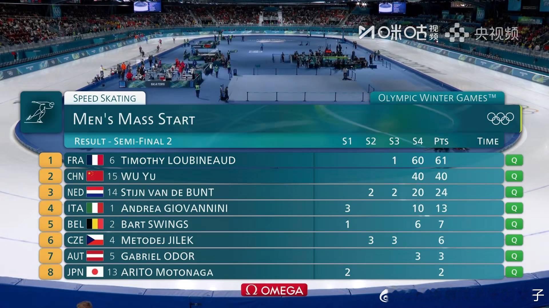 米兰冬奥会 2026年米兰冬奥会速度滑冰男子集体出发半决赛第二组:吴宇获得40积分,位列第二,闯入决赛