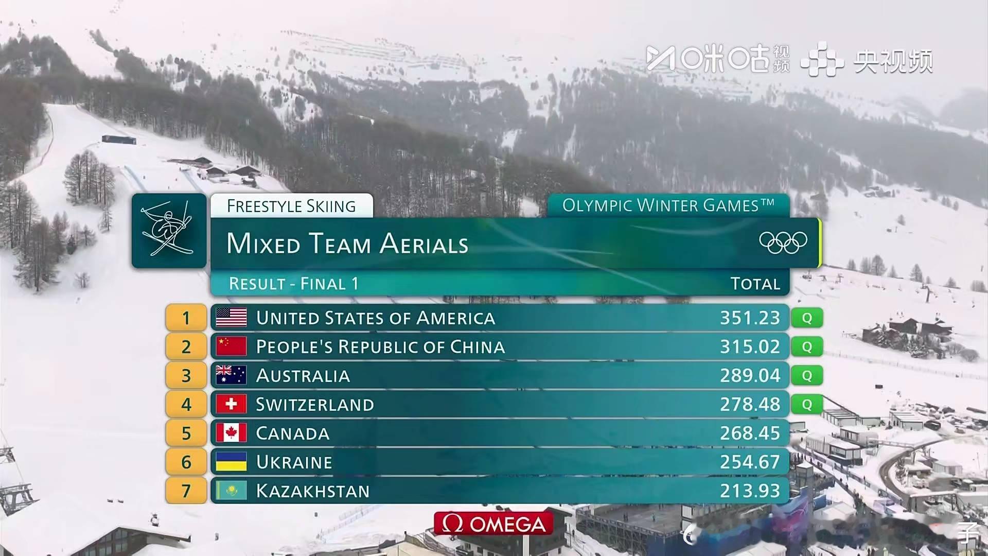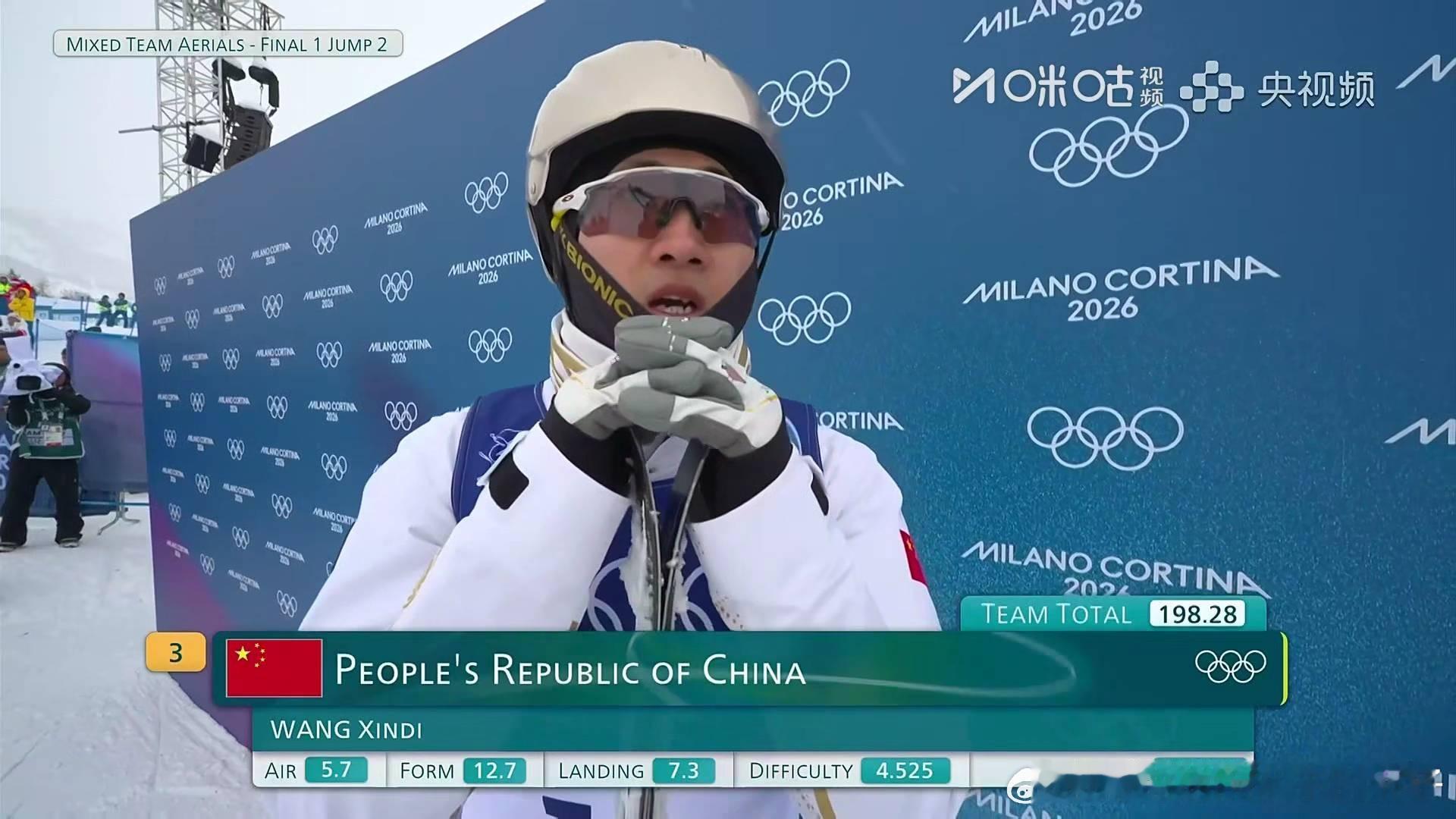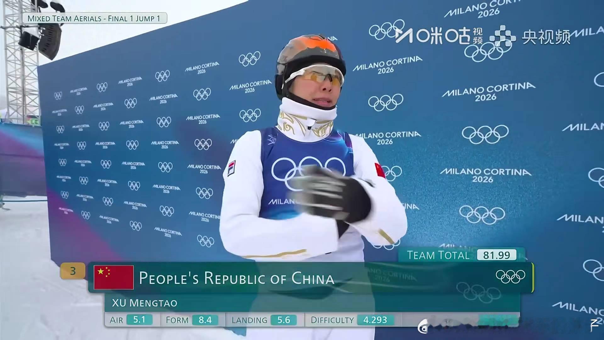 徐梦桃王心迪李天马出战混团中国空中技巧米兰收官之战2026年米兰冬奥会自由式滑雪空中技巧混合团体赛决赛第一轮:徐梦桃81.99分、王心迪116.29分、李天马116.74分,中国队排名第二位晋级第二轮