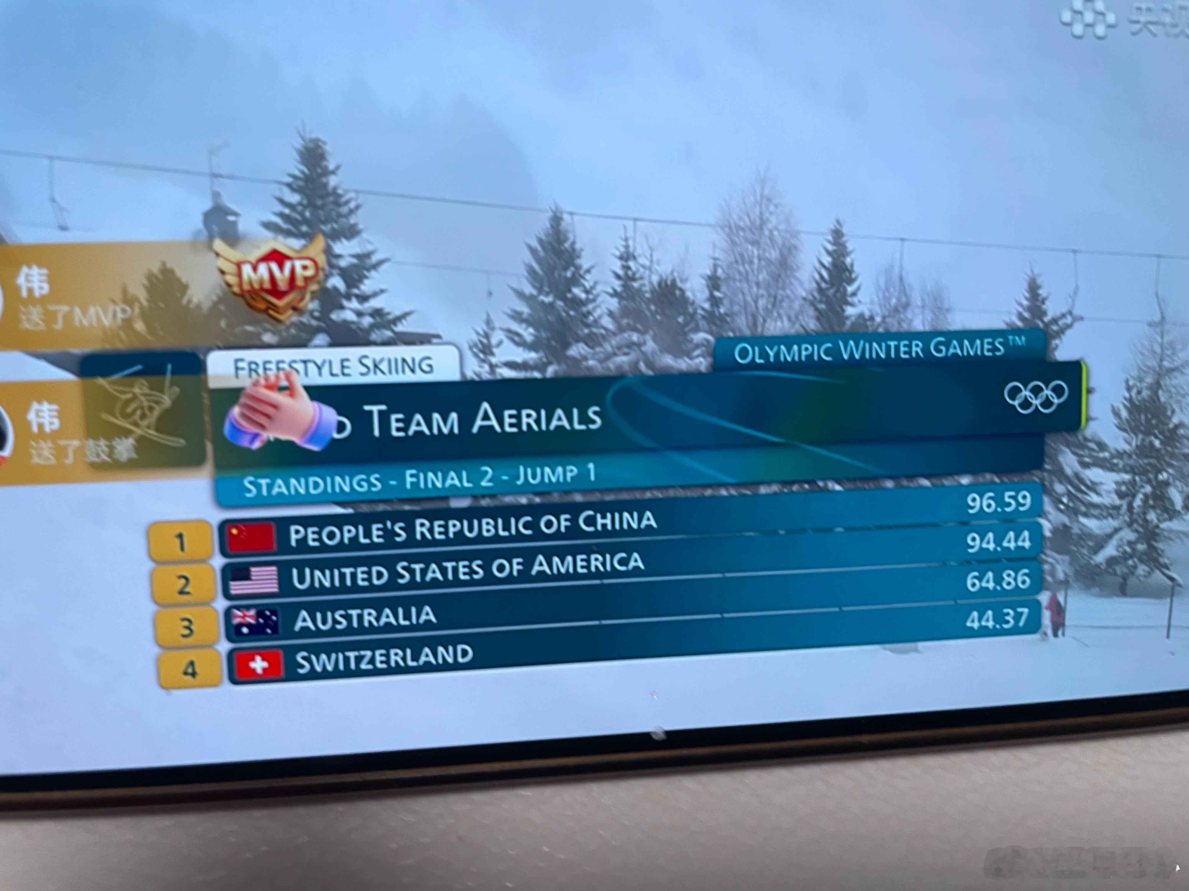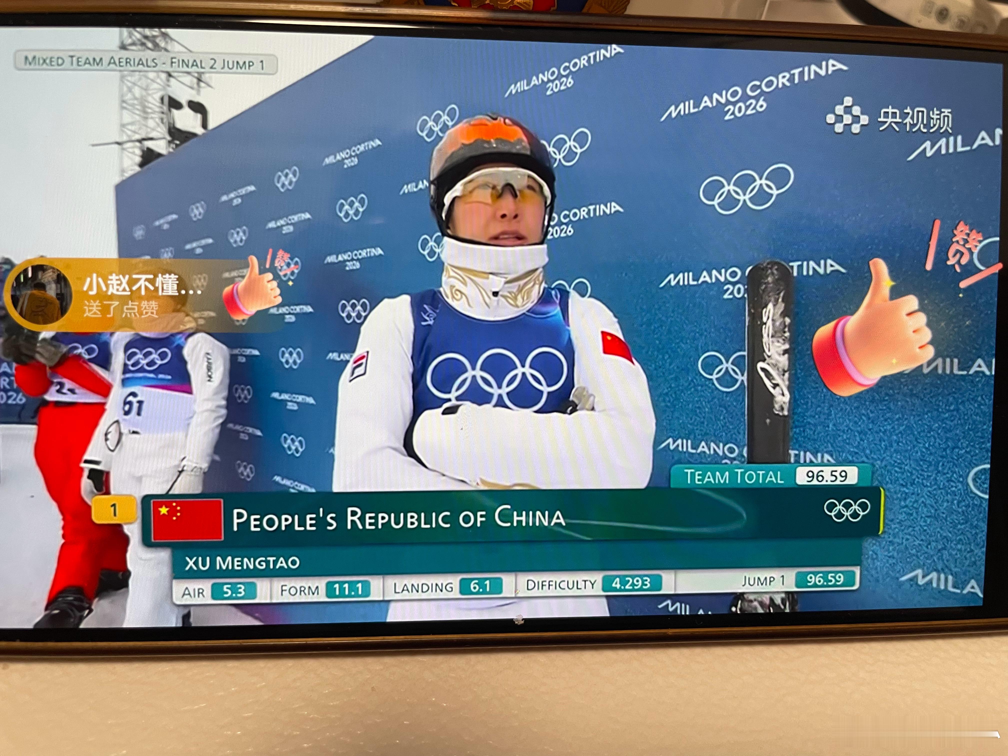 中国空中技巧队进决赛次轮第一轮中国队排名第一徐梦桃96.59分,不愧是大心脏前面两个对手都摔出去了