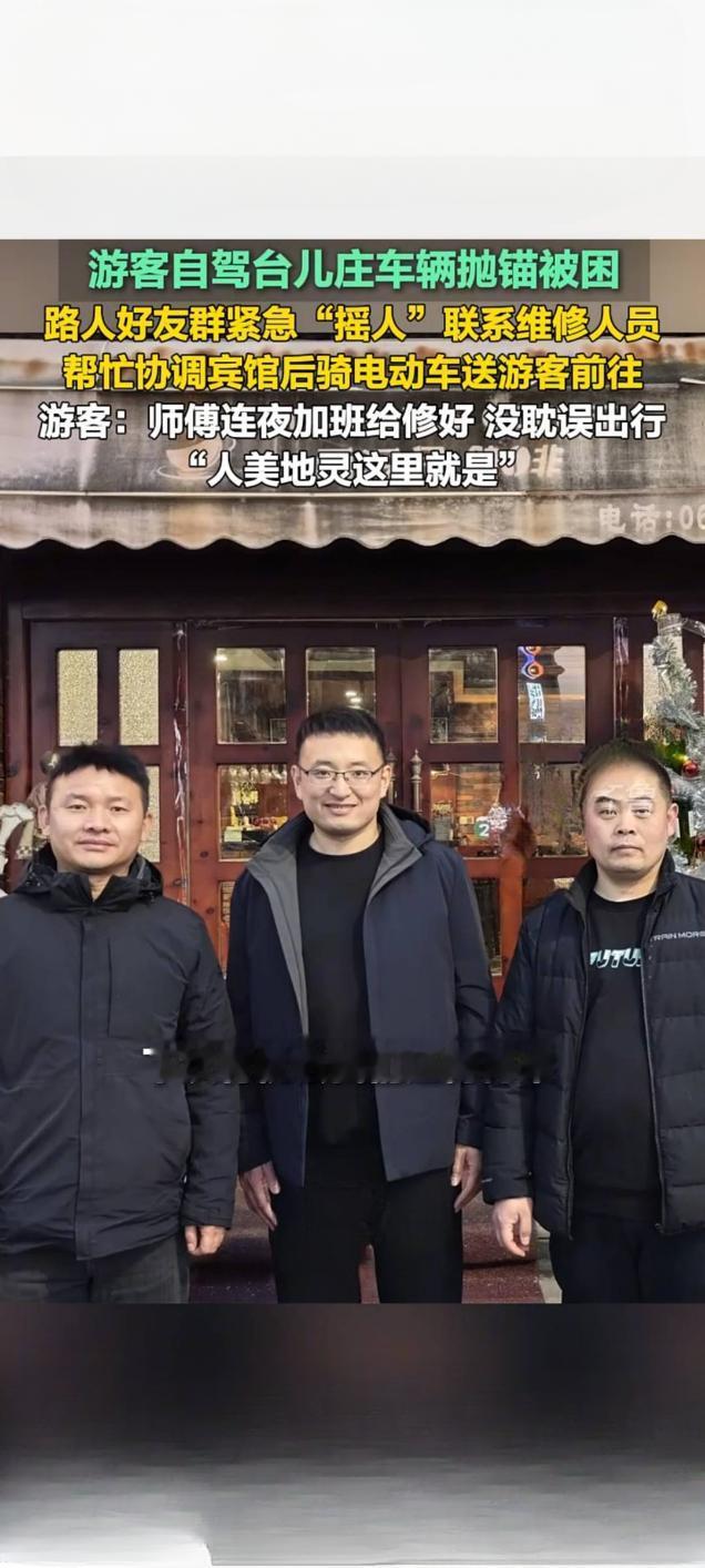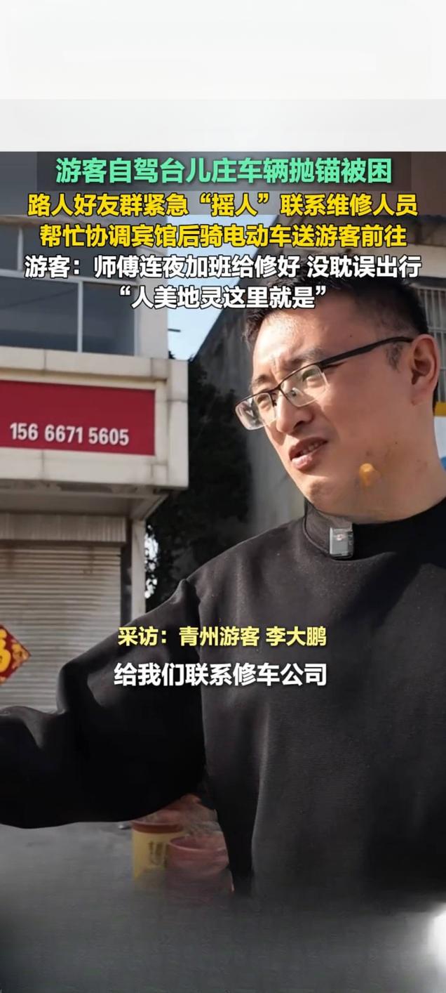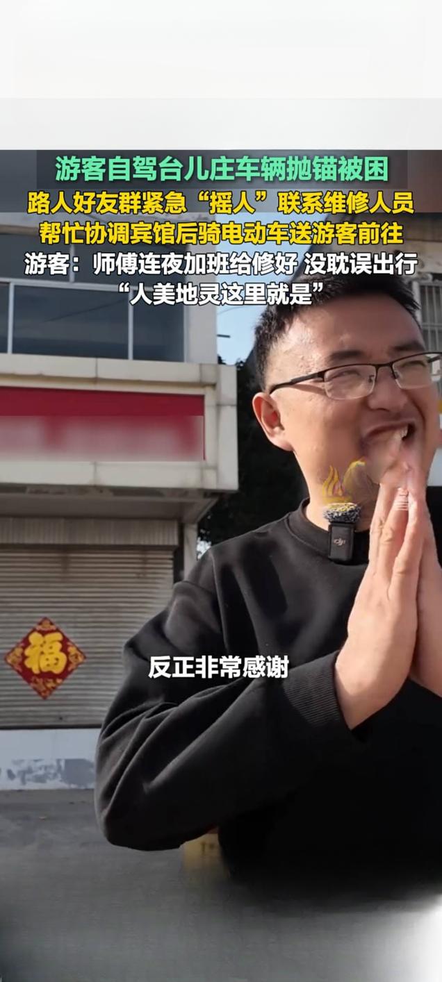 台儿庄游客自驾抛锚遇困 热心路人暖心相助获点赞 2月21日,一则山东枣庄台儿庄游客自驾遇困获路人相助的暖心视频在快手平台引发关注,播放量达2.7万次。视频记录了外地游客自驾前往台儿庄游玩时,车辆突发故障抛锚被困的暖心救援全过程,让网友感受到了台儿庄的城市温度。 据了解,游客自驾行至台儿庄时车辆意外抛锚,身处异地的一行人陷入手足无措的困境。危急时刻,当地热心路人及时伸出援手,发现游客的困难后,第一时间通过好友群紧急“摇人”,多方联络专业维修人员前来抢修。考虑到游客旅途不便,该路人还主动帮忙协调周边宾馆,并骑电动车将游客安全送至住宿地点,全程贴心照料。 为不耽误游客后续行程,维修师傅接到消息后连夜加班抢修,最终顺利将故障车辆修好,游客得以如期开启后续旅程。事后,游客难掩感激之情,直言“师傅连夜加班给修好,没耽误出行,人美地灵这里就是”,朴实的话语满是对台儿庄热心人士的感谢。此次暖心善举,不仅解了游客的燃眉之急,更让台儿庄的温情形象深入人心。旅游台儿庄古城 游观台儿庄古城 轿车抛锚轿车抛锚