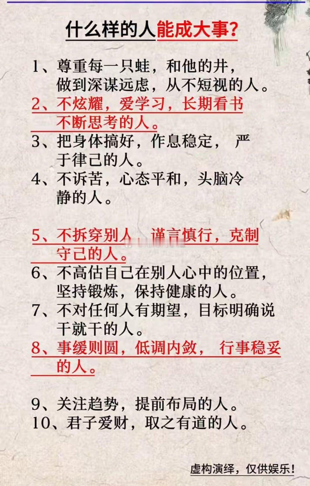 什么样的人能成大事?雅涵读书。·1、尊重每一只蛙,和他的井,做到深谋远虑,从不短视的人。·2、不炫耀,爱学习,长期看书,不断思考的人。·3、把身体搞好,作息稳定,严于律己的人。·4、不诉苦,心态平和,头脑冷静的人。·5、不拆穿别人,谨言慎行,克制守己的人。·6、不高估自己在别人心中的位置,坚持锻炼,保持健康的人。·7、不对任何人有期望,目标明确说干就干的人。·8、事缓则圆,低调内敛,行事稳妥的人。·9、关注趋势,提前布局的人。·10、君子爱财,取之有道的人。