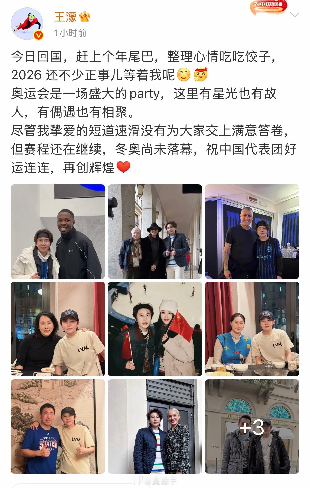 王濛再谈短道队米兰成绩 尽管我挚爱的短道速滑没有为大家交上满意答卷,但赛程还在继续,冬奥尚未落幕,祝中国代表团好运连连,再创辉煌。今日回国,赶上个年尾巴,整理心情吃吃饺子,2026 还不少正事儿等着我呢奥运会是一场盛大的party,这里有星光也有故人,有偶遇也有相聚。尽管我挚爱的短道速滑没有为大家交上满意答卷,但赛程还在继续,冬奥尚未落幕,祝中国代表团好运连连,再创辉煌为中国冬奥健儿加油