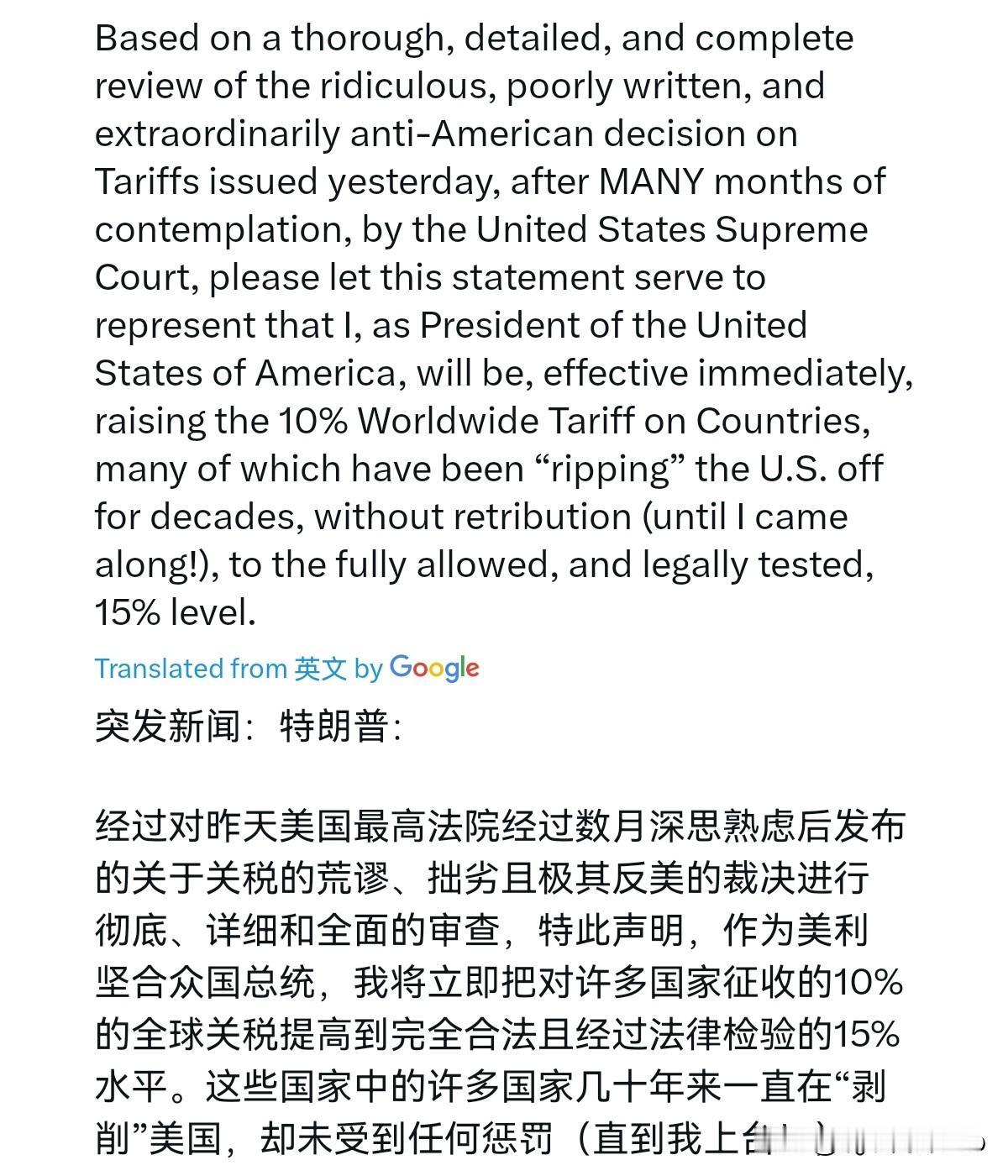 特朗普再次撂话!2月21日,特朗普表示,经过对美国最高法院数月审议后于昨日作出的那份荒谬、措辞拙劣、且极度反美的关税裁决,进行全面、详尽且完整的复核后,本声明正式宣布:我,美利坚合众国总统,即刻生效,将此前对全球多国征收的10%关税——其中许多国家几十年来一直在“剥削”美国、却从未付出代价(直到我上任!)——上调至法律允许且已通过司法检验的15%。 很显然,从特朗普的这一回应来看,美国最高法院的这一裁决,让特朗普是暴跳如雷,以至于宣布加税10%之后,特朗普余怒未消,又扬言加税到15%。特朗普的这一行为把其本人的喜怒无常,霸道,展现的淋漓尽致。其所谓的其中许多国家几十年来一直在“剥削”美国、却从未付出代价,这更是颠倒黑白的胡说八道。 事实上,美国通过美元霸权、技术优势、消费市场早已从中攫取了巨额红利,何来“被剥削”一说?美国自己内部治理出问题了,美国一点都不从自身找问题,而是一股脑甩给全世界,用“受害者”的谎言包装其霸权行径。显然,美国靠霸凌抢不来繁荣,靠甩锅也解决不了困境。特朗普的这一作为,只会激起内外更大的反对,我们当然也不会接受这种肆意妄为。