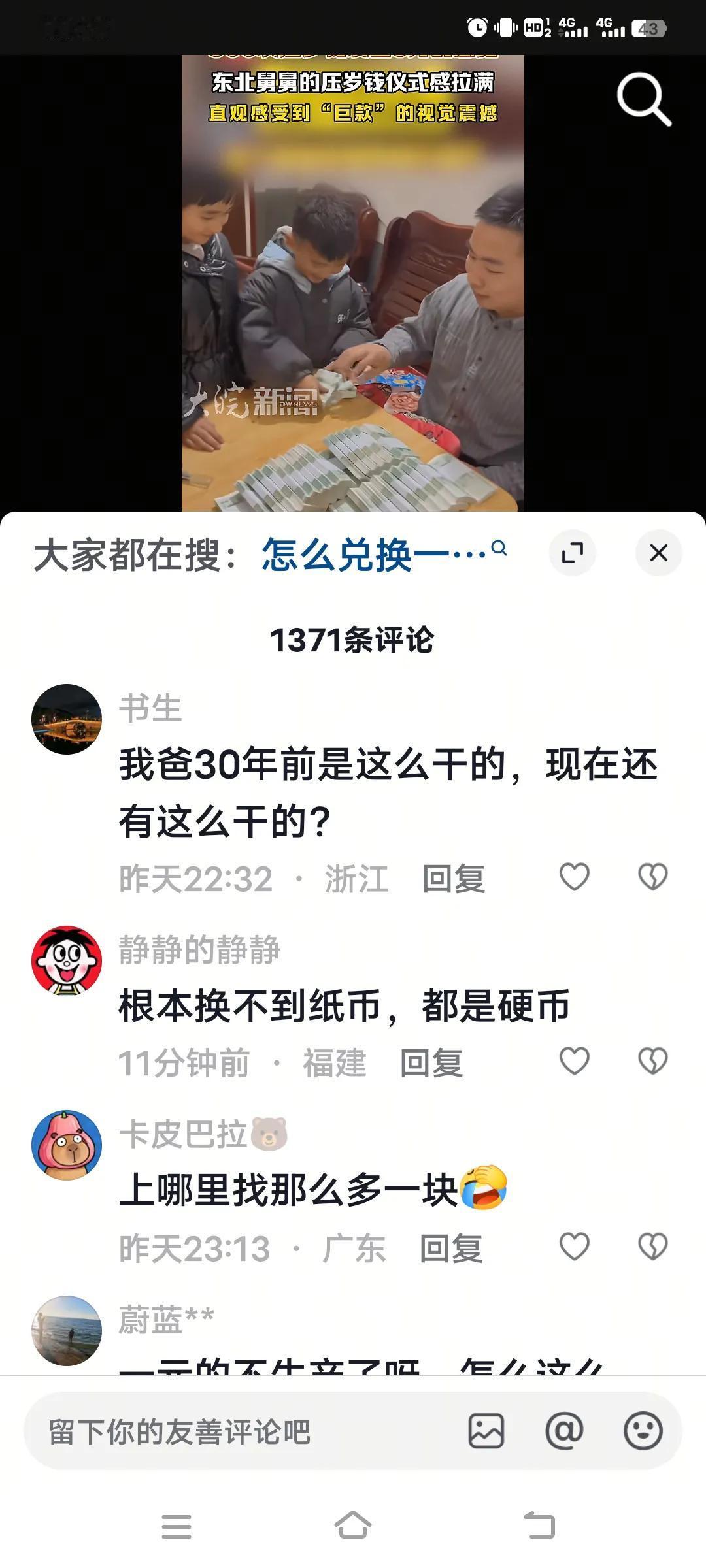 这也太有意思啦!我认为这才是名副其实的压岁钱。500块的压岁钱,竟营造出了5万的气势,这位当舅舅的可真是有心了!评论区里,有网友质疑:上哪儿找那么多一元纸币啊?还有人表示根本找不到纸币,诸如此类,看法不一。 近日,湖北有位舅舅给六个外甥发压岁钱。他把百元大钞都换成了一元一张的小票,将500元分成5叠,每100块便是100张1元。每个外甥都拿到5叠,个个兴奋得尖叫起来。这才是真正洋溢着欢乐的压岁钱啊! 舅舅逐个发放,还喊着“下一位”,搞得跟颁奖典礼一样,场面着实热闹非凡! 压岁钱 小孩儿压岁钱