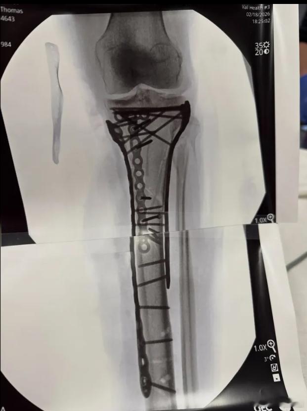 美国重伤滑雪名将第五次手术耗时六个多小时 X光显示腿部螺钉钢板密布自嘲已成仿生人