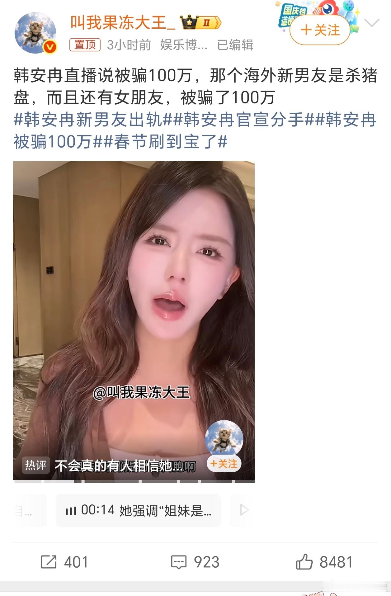 韩安冉被骗100万为啥被封了,还能出来跳?这个韩安冉有啥正向价值观吗?