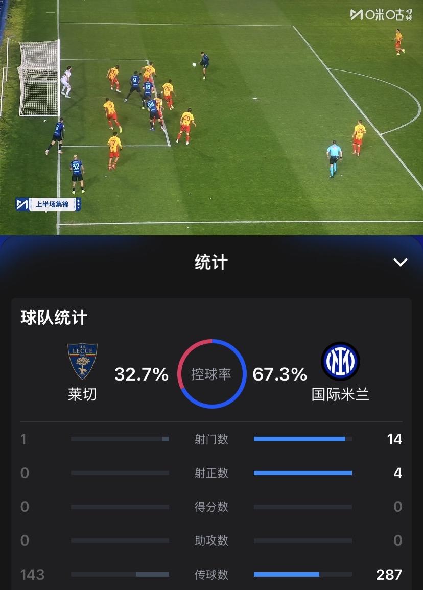 有些混乱!意甲第26轮国际米兰客场挑战莱切,上半场双方均无建树战成0:0, 从上半场看,国际米兰是混乱的,无论是进攻,还是防守亦或是中场的组织传导。执行大轮换的国际米兰虽然场上优势明显,但威胁进攻并不多,另外国际米兰后防线整体状态一般,半场表现最出色的当属皮奥.埃斯波西托。 期待下半场国际米兰能支棱起来,全力争胜。