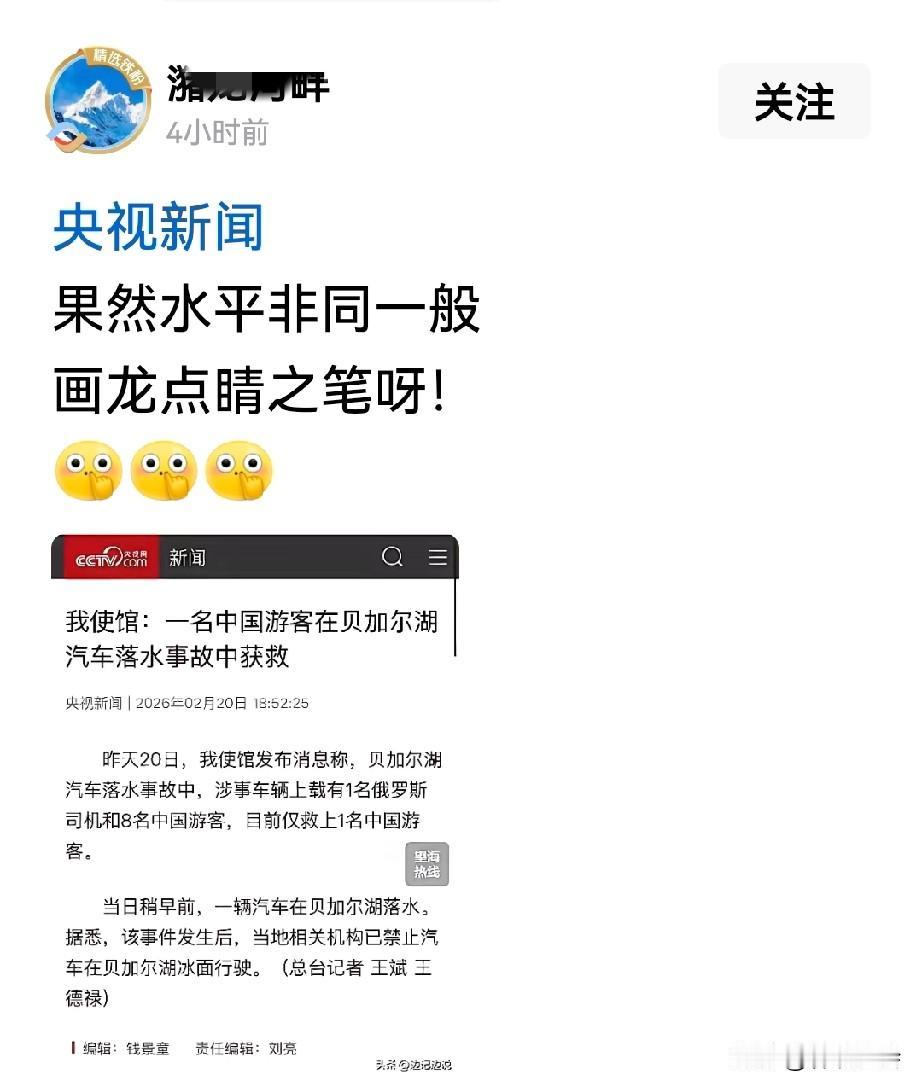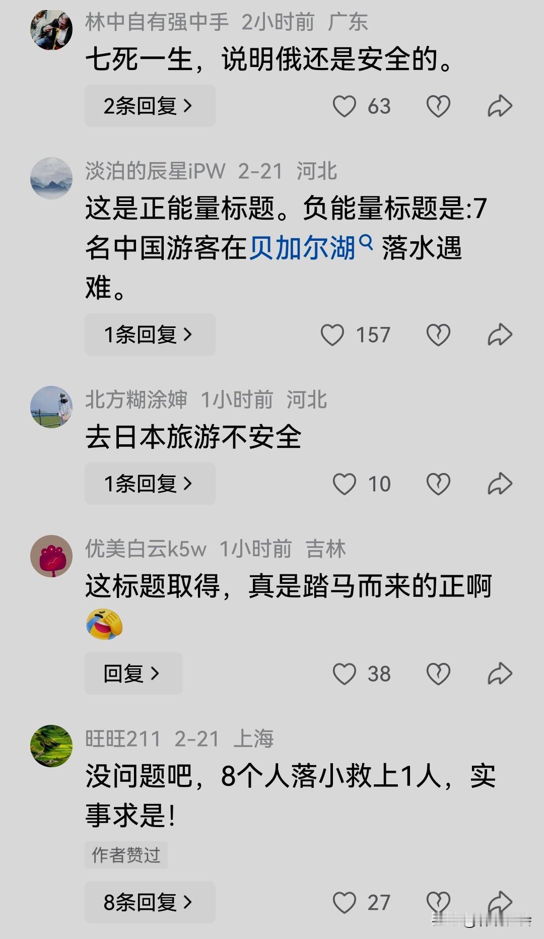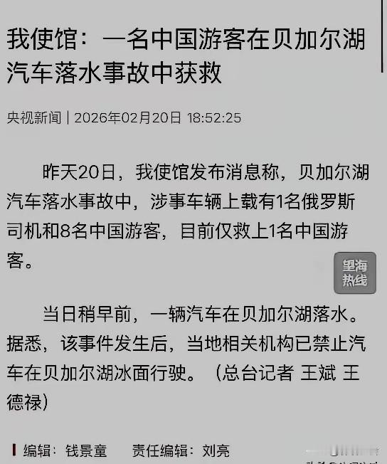 贝尔加湖汽车落水事故中,涉事车辆载有1名俄罗斯司机和8名中国游客,仅救上1名中国游客。 2月20日,新闻报道了该起事件,其标题为:《一名中国游客在贝尔加湖落水事故中获救》,这个标题也算实事求是,所述内容也不虚。 网友们发帖称:果然水平非同一般的画龙点睛之笔。 网友评论:假如换成《7名中国游客在贝加尔湖落水遇难》的标题,可能就失去了其中含义。