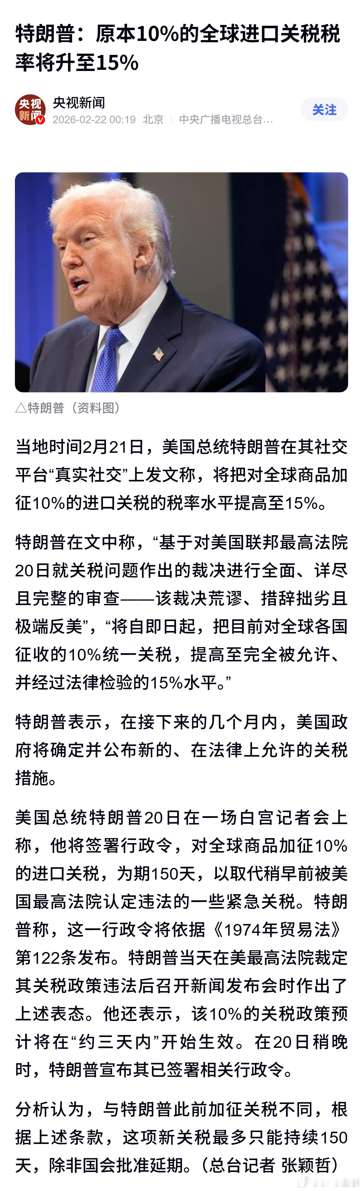特朗普:原本10%的全球进口关税税率将升至15%