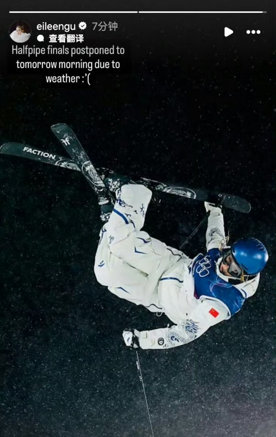 谷爱凌U型场地决赛推迟谷爱凌发文:由于天气原因,U池决赛推迟到明天早上10:40