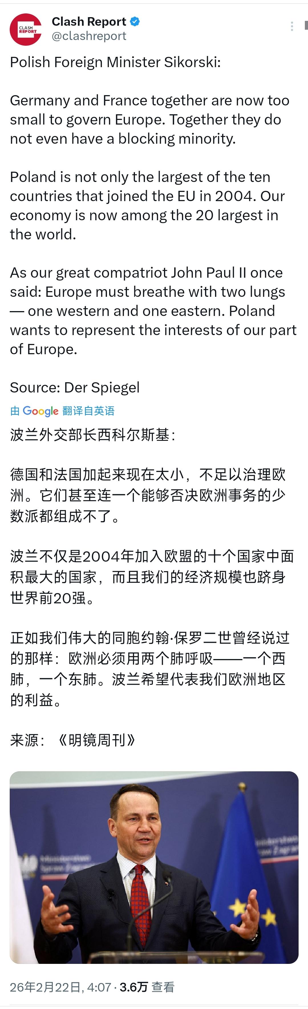 波兰外交部长西科尔斯基今天(北京时间2月22日)表示:“德国和法国加起来现在太小,不足以治理欧洲。它们甚至连一个能够否决欧洲事务的少数派都组成不了。 波兰不仅是2004年加入欧盟的十个国家中面积最大的国家,而且我们的经济规模也跻身世界前20强。 正如我们伟大的同胞约翰·保罗二世曾经说过的那样:欧洲必须用两个肺呼吸个西肺,一个东肺。波兰希望代表我们欧洲地区的利益。” [机智]评几句:三次亡国还是有原因的,波兰还是应该低调,不应自大。历史上波兰本就是俄国通往欧洲的走廊,也是日耳曼人东进的垫脚石,其地缘悲剧根源在于地处四战之地、缺乏战略纵深,一马平川无险可守,夹在德俄两大强权之间,本应谨慎自保,而非高调抢权。西科尔斯基宣称德法太小、波兰要主导欧洲双肺呼吸,这番言论充满不自量力的傲慢,完全无视自身脆弱的地缘宿命与历史教训。波兰经济与实力远未到引领欧洲的地步,却急于挑战法德核心、争当中东欧旗手,本质是借反俄姿态博取存在感,把投机当资本,把逞强当实力。这种忘本式自大,只会再次将波兰推向大国博弈的风口浪尖,忘记历史的教训,往往会重复历史的悲剧,实力撑不起野心,最终只会自食苦果。