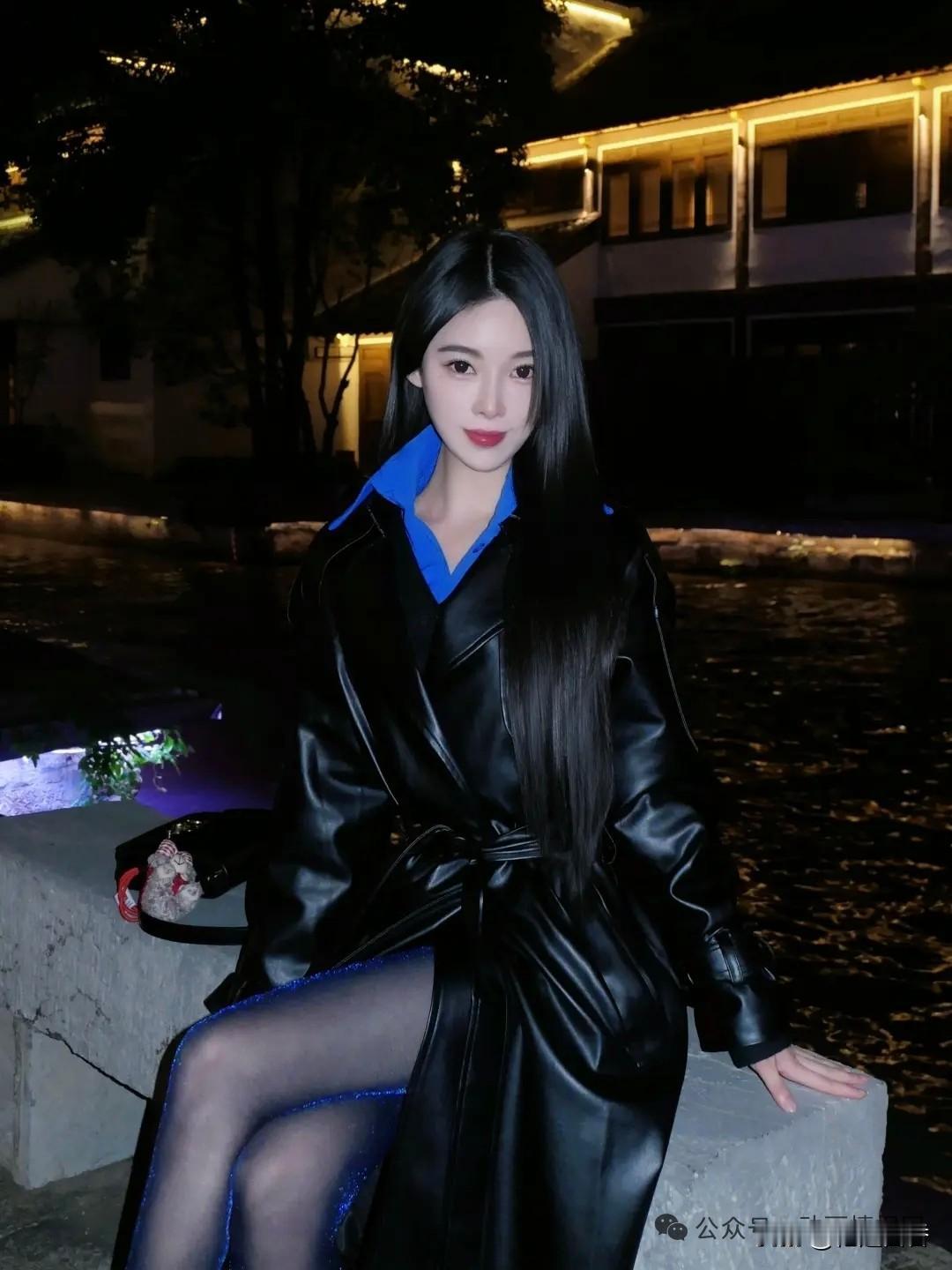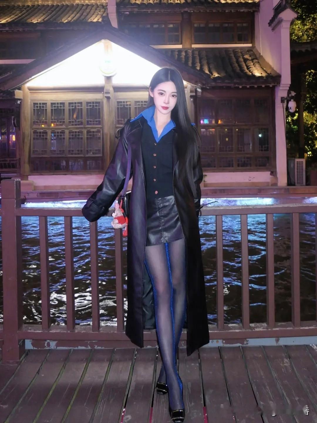 夜晚的优雅穿搭,黑色皮衣与蓝色内搭的完美结合,尽显时尚魅力。