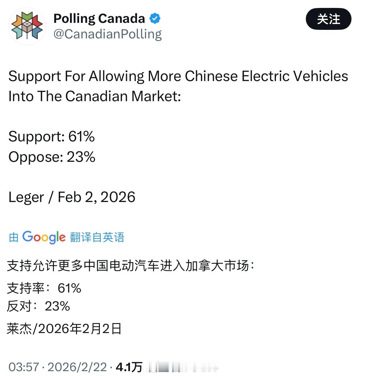 加拿大媒体发布“中国电车进入加拿大市场”的投票率,六成支持、两成反对