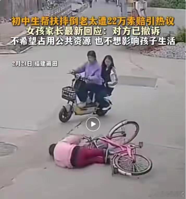 “两初中女生扶起摔倒老太遭索赔22万元”,女孩家长称:老人一方已撤诉,不希望再占用公共资源,也不想影响孩子生活近日,福建一老太骑自行车在拐弯处摔倒,两名初中女生骑电动车侧向驶来帮忙扶起,这起无接触事故中扶老人女生被交警定次责任,摔倒老太要找女孩家属索赔22万元。B2月21日,事件中的女孩母亲郑女士表示,目前事情已经妥善处理,原告方已撤诉,此前发布的抖音和朋友圈相关内容也已删除,不希望再占用公共资源。