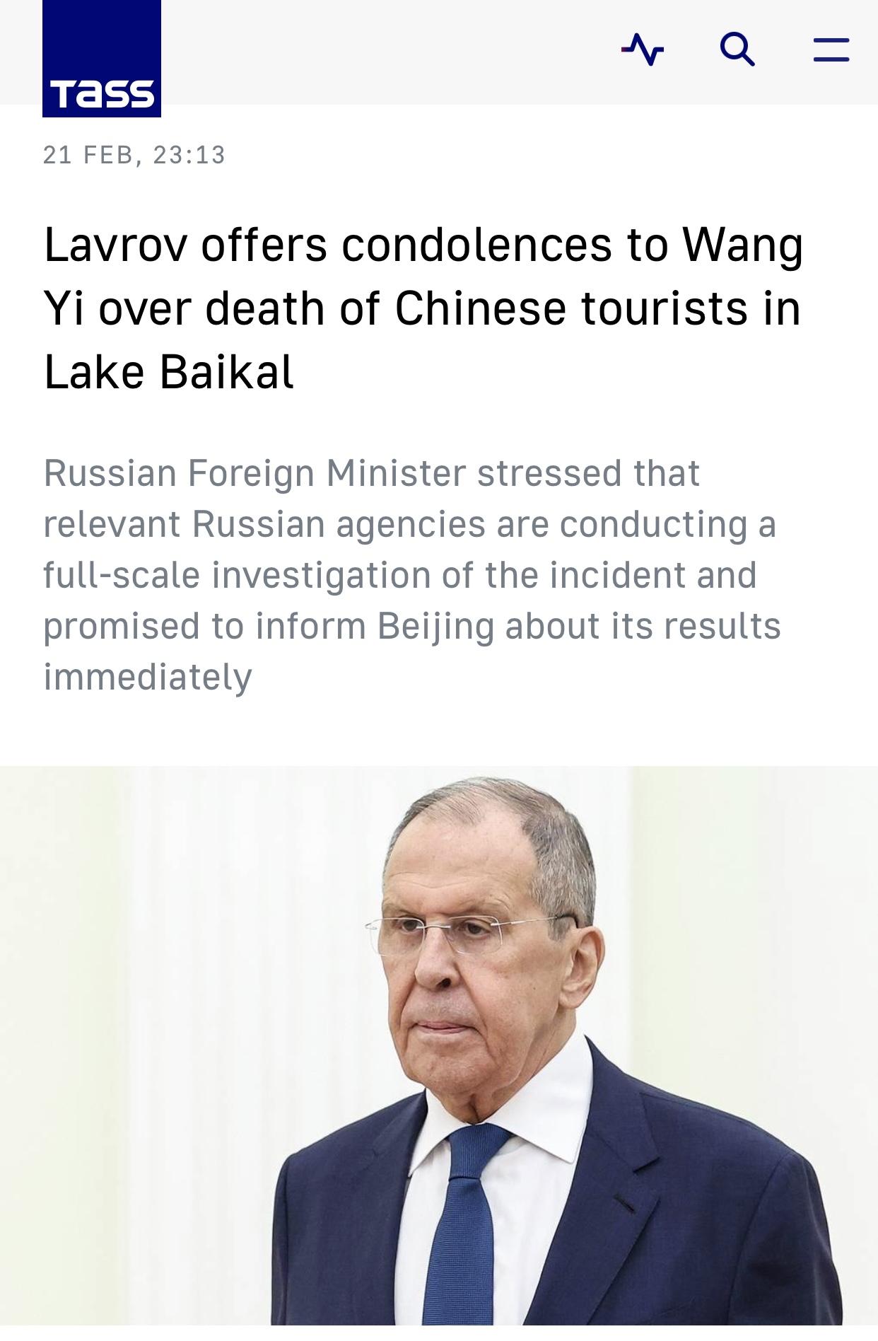 塔斯社:拉夫罗夫就中国游客遇难一事向中方表达哀悼 塔斯社莫斯科2月21日电:俄罗斯外交部表示,俄罗斯外交部长谢尔盖·拉夫罗夫就2月20日中国游客在贝加尔湖遇难一事,向中国外交部长王毅表示哀悼。 报道说,俄外交部声明说,”拉夫罗夫强调,俄罗斯相关机构正在对此事进行全面调查,并承诺将立即向北京方面通报调查结果”。 报道说,俄外交部长请求向游客家属转达他的慰问之意,并表示希望这一悲剧事件不会对双边旅游交流的积极发展产生负面影响(The minister asked to convey his words of sympathy to the families of the tourists and expressed hope that this tragic incident will not have a negative impact on the positive development of bilateral tourist exchanges)。 报道的原标题是《Lavrov offers condolences to Wang Yi over death of Chinese tourists in Lake Baikal》(拉夫罗夫就中国游客在贝加尔湖死亡向王毅表示哀悼)。
