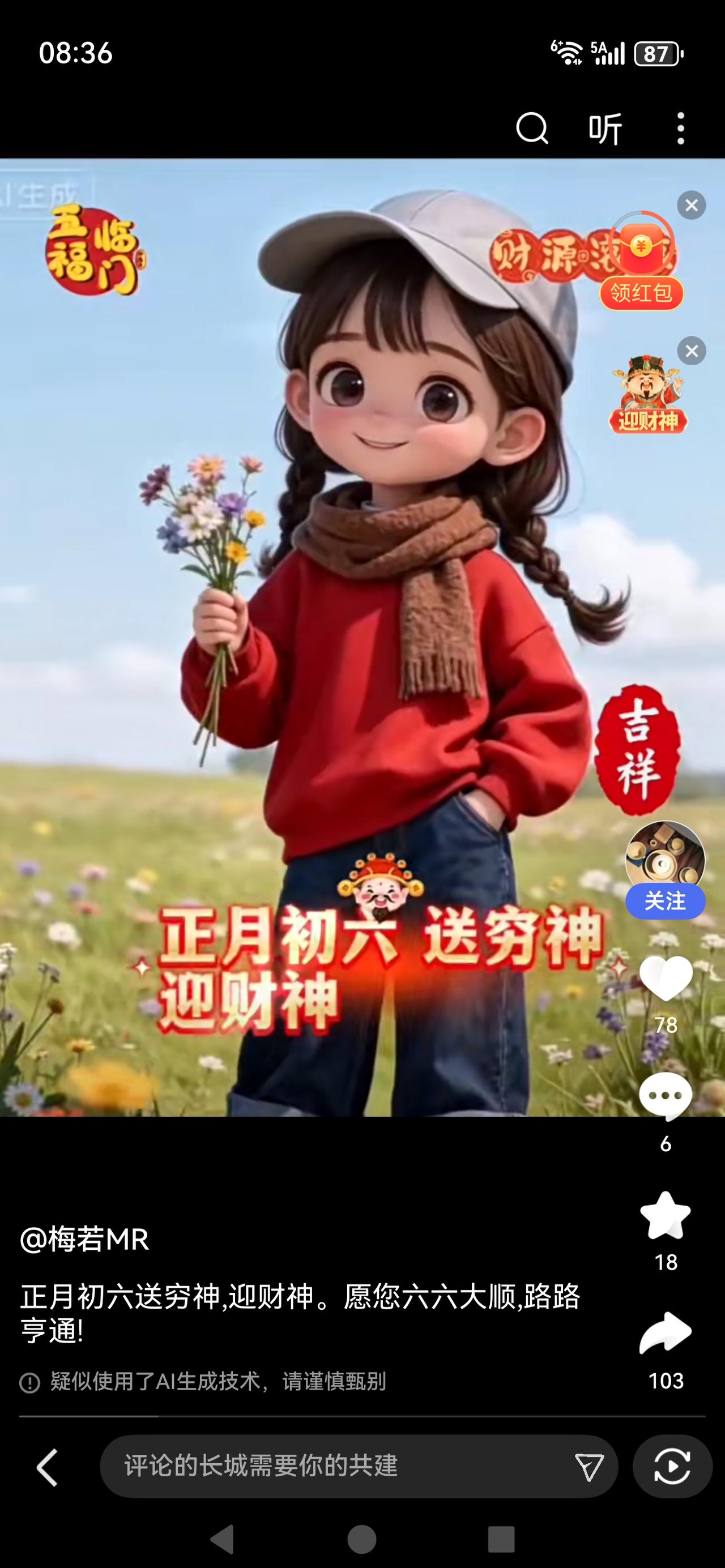 正月初六,送穷纳福添喜气 六六大顺,数字六寓意顺利,初六送走穷困,迎来顺遂。 清理“”穷气”,咱们除夕到初五“”不扫地,不到垃圾”的禁忌,怕扫走财气。积攒下来的被看成穷气,穷土。初六解除这个禁忌,集中清扫送出,驱走穷鬼。 初五迎财神,初六送穷鬼,一迎一送,紧密相连,春节团圆结束。初六新的一年,开个好头。初六大顺好日子 初六迎春纳福