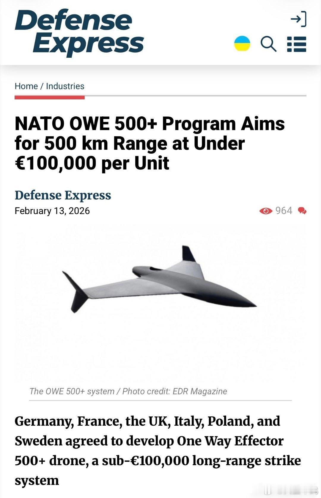 六个欧洲北约国家——德国、法国、英国、意大利、波兰和瑞典——同意在"欧洲长程打击方案"(European Long Range Strike Approach)框架下,共同研发一款低成本、射程超过500公里的单向打击无人机,据Hartpunkt报道。