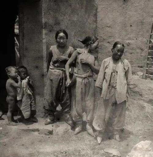 这张照片拍摄于20世纪初的西北,三位农村妇女和两个幼童在自家土坯房前的瞬间。照片中的三位妇女和两个孩子,是清末西北农村最普通的家庭。 她们身处的环境极为简陋,粗糙的土坯墙、裸露的泥土地,没有任何像样的家具或装饰,尽显生活的贫瘠。衣着破旧不堪,甚至有一位妇女衣不蔽体,这并非刻意为之,而是当时底层民众普遍的生存状态。孩子们也几乎赤身裸体,反映出当时物资的极度匮乏。