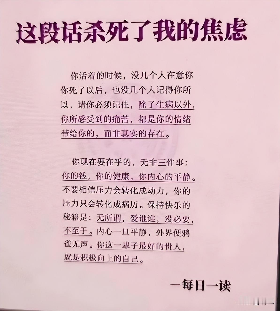 最近刷到一段特别戳人的话,直接给我整通透了 —— 咱活着的时候,真没几个人天天盯着你;就算哪天走了,也没几个人能一直记着你。所以啊,除了生病带来的疼,你感受到的所有痛苦,说白了,都是你的情绪在瞎折腾,根本不是啥真实存在的事儿! 别再瞎内耗了!你真正要在乎的,就三件事:手里的钱、身体的健康、还有内心的平静。 别信什么 “压力转化成动力” 的鬼话,那都是忽悠人的!压力到最后,多半都变成病历本上的字儿了。想快乐?就记住这八个字:无所谓,爱谁谁,没必要,不至于。 你品品,当你内心真的平静下来,外界那些乱七八糟的声音,是不是瞬间就鸦雀无声了? 所以啊,别跟自己较劲了。把注意力收回来,搞钱、养身体、稳住心态。你这辈子最好的贵人,从来不是别人,就是那个愿意积极向上的自己。