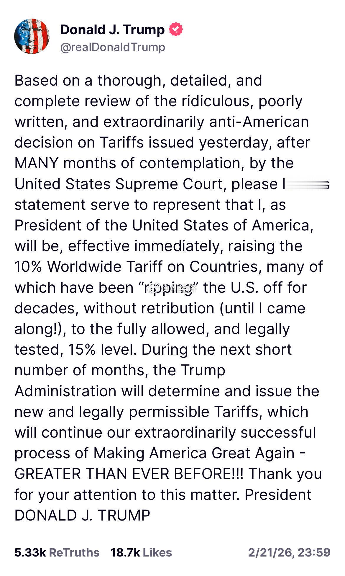 特朗普:原本10%的全球进口关税税率将升至15%ps:可能税期15个月理论上之