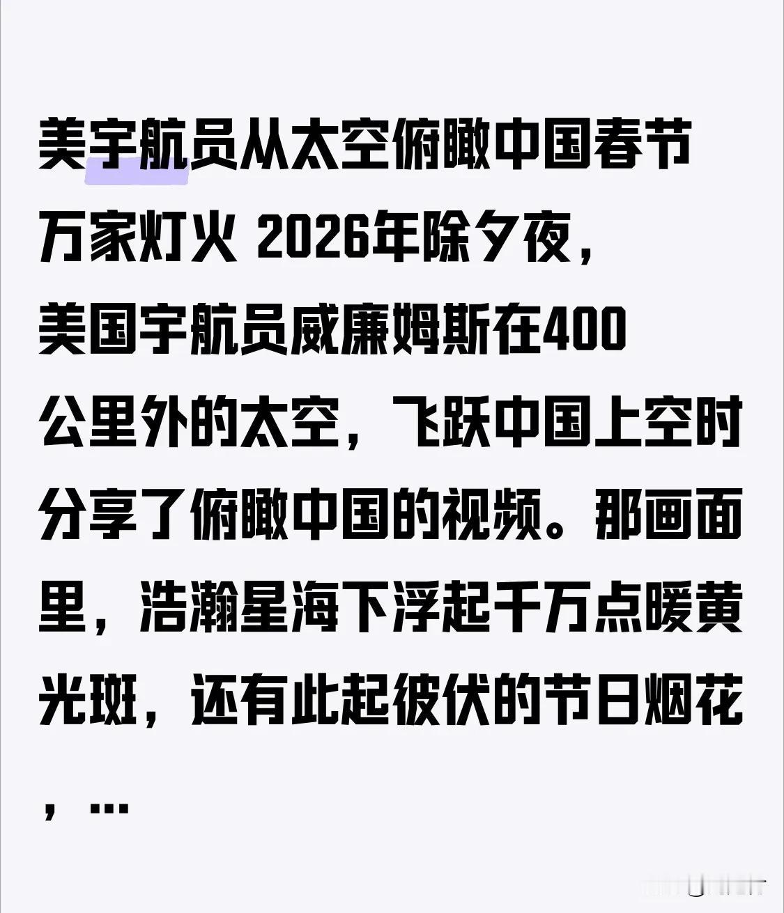 美宇航员从太空俯瞰中国春节万家灯火 2026年除夕夜,美国宇航员威廉姆斯在400公里外的太空,飞跃中国上空时分享了俯瞰中国的视频。那画面里,浩瀚星海下浮起千万点暖黄光斑,还有此起彼伏的节日烟花,过年氛围感直接拉满。 这位宇航员不禁感慨:“It’s not a country. It’s a living constellation.”每一点微光背后,都是真实的人间。上海的繁华霓虹、云南的煤油灯、深圳的服务器、陕西窑洞的苹果,都在这万家灯火里。二十年前中国东部沿海还如昏暗渔火带,如今整片大陆已璀璨如光网,这就是中国的发展与温度。 太空过除夕 宇航员 外国宇航员