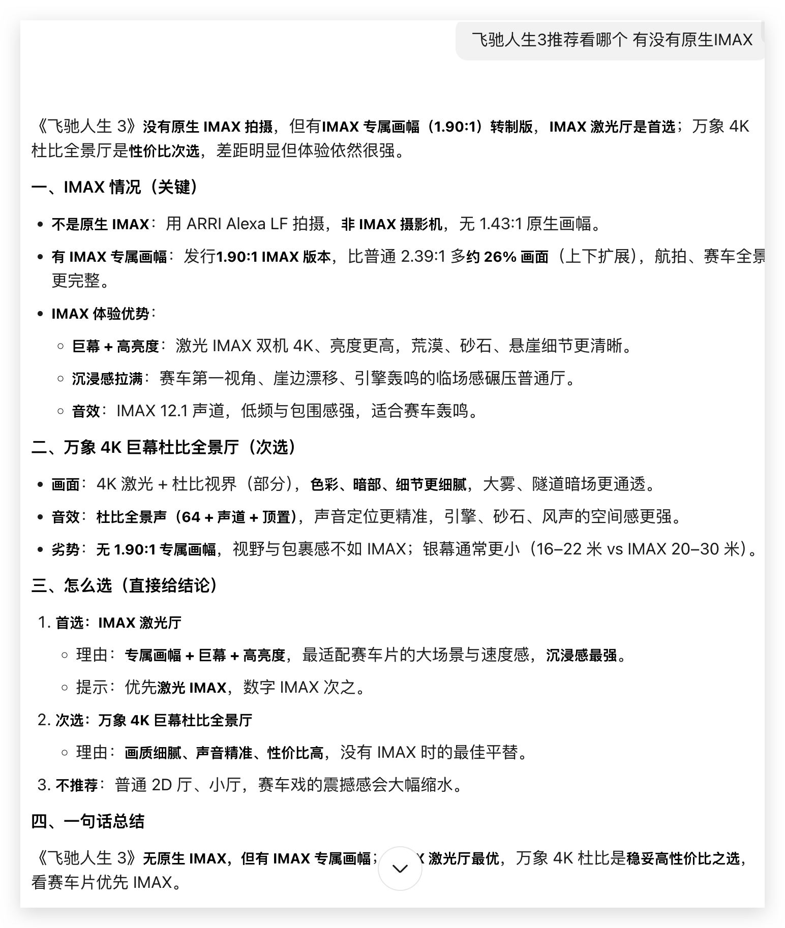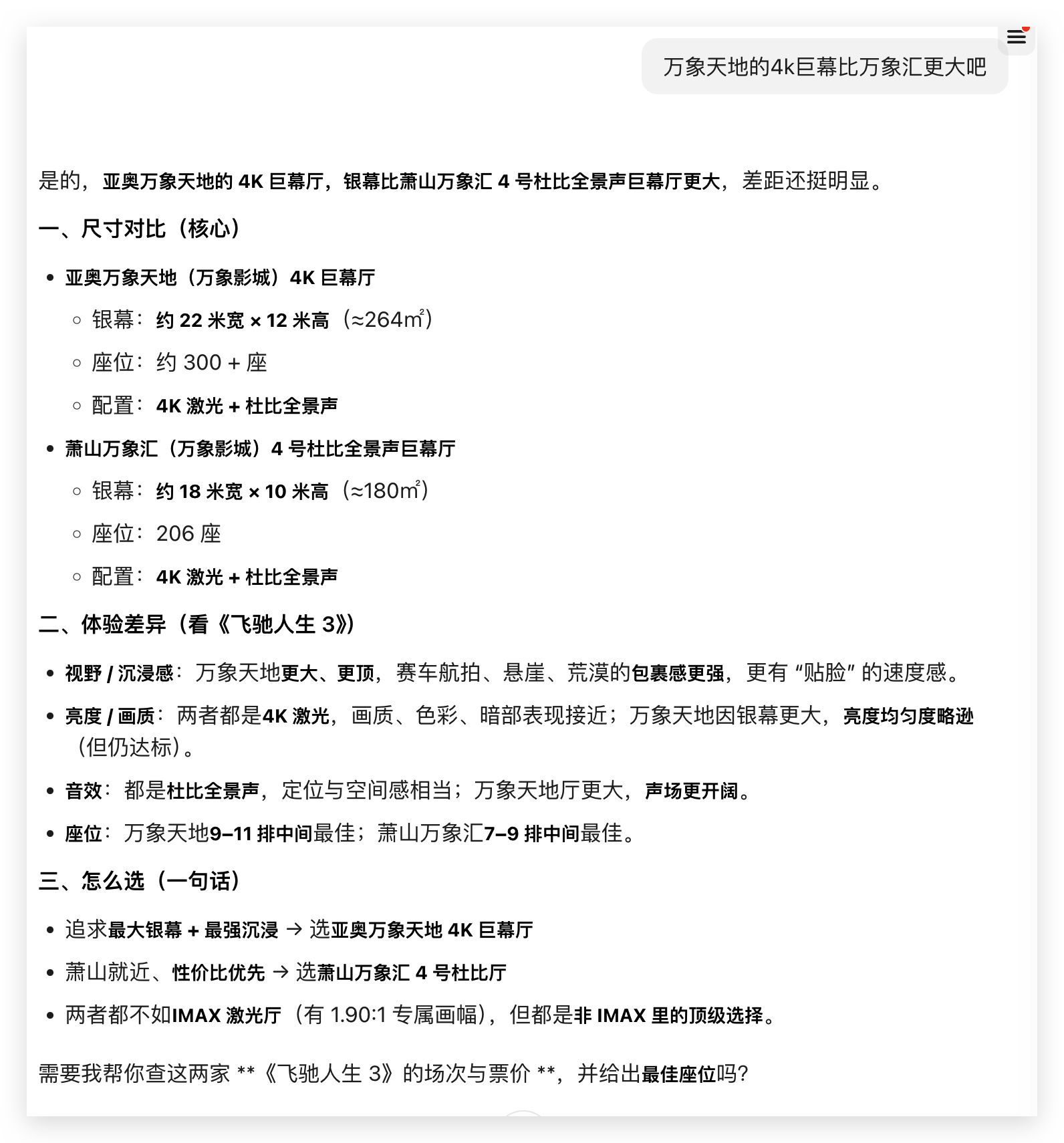 AI太特么好用了...尤其在资料搜集/对比场景之前我只知道IMAX屏幕更大,画幅更完整但我只需要问一句豆包,瞬间整理出详细参数对比还会根据我的地址位置,推荐影院和座位