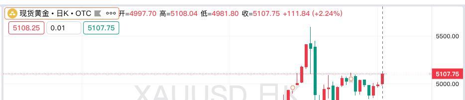 周五金价大幅飙升, 现货黄金站上五千一百美元。 回顾一下,当日运行情况。 现货黄金高开高走, 开盘价4997.7美元, 盘中最高升至5108.4美元, 最低价为4981.8美元, 最终收盘于5107.75美元, 较上一日上涨111.84美金。 对于现货黄金后市, 期货小褚观点不变, 还是认为有望继续上攻5150--5200美元。