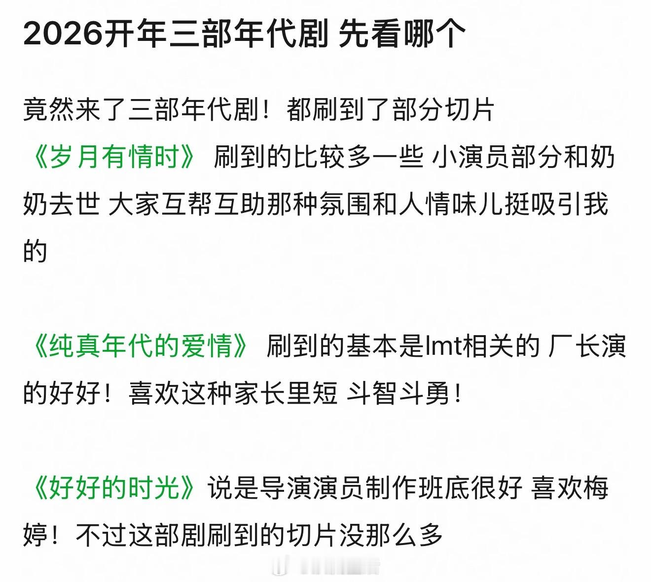 春节三大年代剧来袭,岁月有情时、纯真年代的爱情、)好好的时光,大家都在看哪部呀?